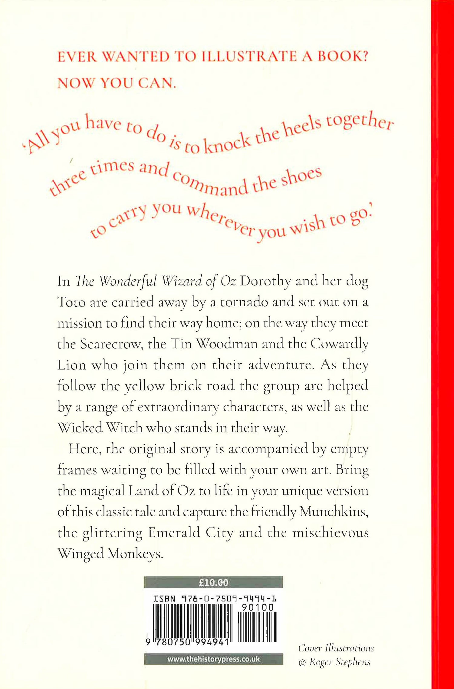 Ever wanted to illustrate a book? Now you can. 'All you have to do is to knock the heels together three times and command the shoes to carry you wherever you wish to go.' In The Wonderful Wizard of Oz Dorothy and her dog Toto are carried away by a tornado and set out on a mission to find their way home; on the way they meet the Scarecrow, the Tin Woodman and the Cowardly Lion who join them on their adventure. As they follow the yellow brick road the group are helped by a range of extraordinary characters, as well as the Wicked Witch who stands in their way. Here, the original story is accompanied by empty frames waiting to be filled with your own art. Bring the magical Land of Oz to life in your unique version of this classic tale and capture the friendly Munchkins, the glittering Emerald City and the mischievous Winged Monkeys.