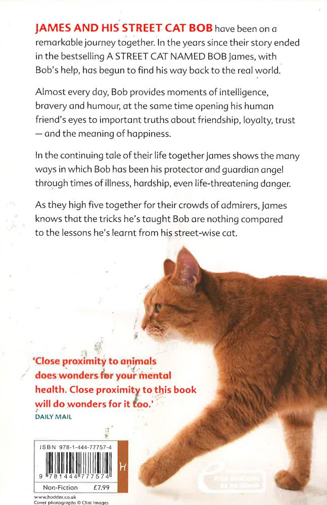 The incredible sequel to the bestselling A STREET CAT NAMED BOB - the moving and uplifting true story of an unlikely friendship between a man on the streets and the ginger cat who adopts him, soon to be a major motion picture. 'Since Bob has appeared, I've made huge strides in my life. For more than a decade I was a homeless drug addict. I was lost to the world and had forgotten what was important in life. Now I've got myself back on my two feet, but as I put the past behind me, I'm still stepping unsteadily into the future. I still need help in the right direction. Bob is always there to offer guidance and friendship.' James and his street cat Bob have been on a remarkable journey together. In the years since their story ended in the bestselling A STREET CAT NAMED BOB James, with Bob's help, has begun to find his way back to the real world. Almost every day, Bob provides moments of intelligence, bravery and humour, at the same time opening his human friend's eyes to important truths about friendship, loyalty, trust - and the meaning of happiness. In the continuing tale of their life together James shows the many ways in which Bob has been his protector and guardian angel through times of illness, hardship, even life-threatening danger. As they high five together for their crowds of admirers, James knows that the tricks he's taught Bob are nothing compared to the lessons he's learnt from his street-wise cat. *This book may have minor shelfwear.
