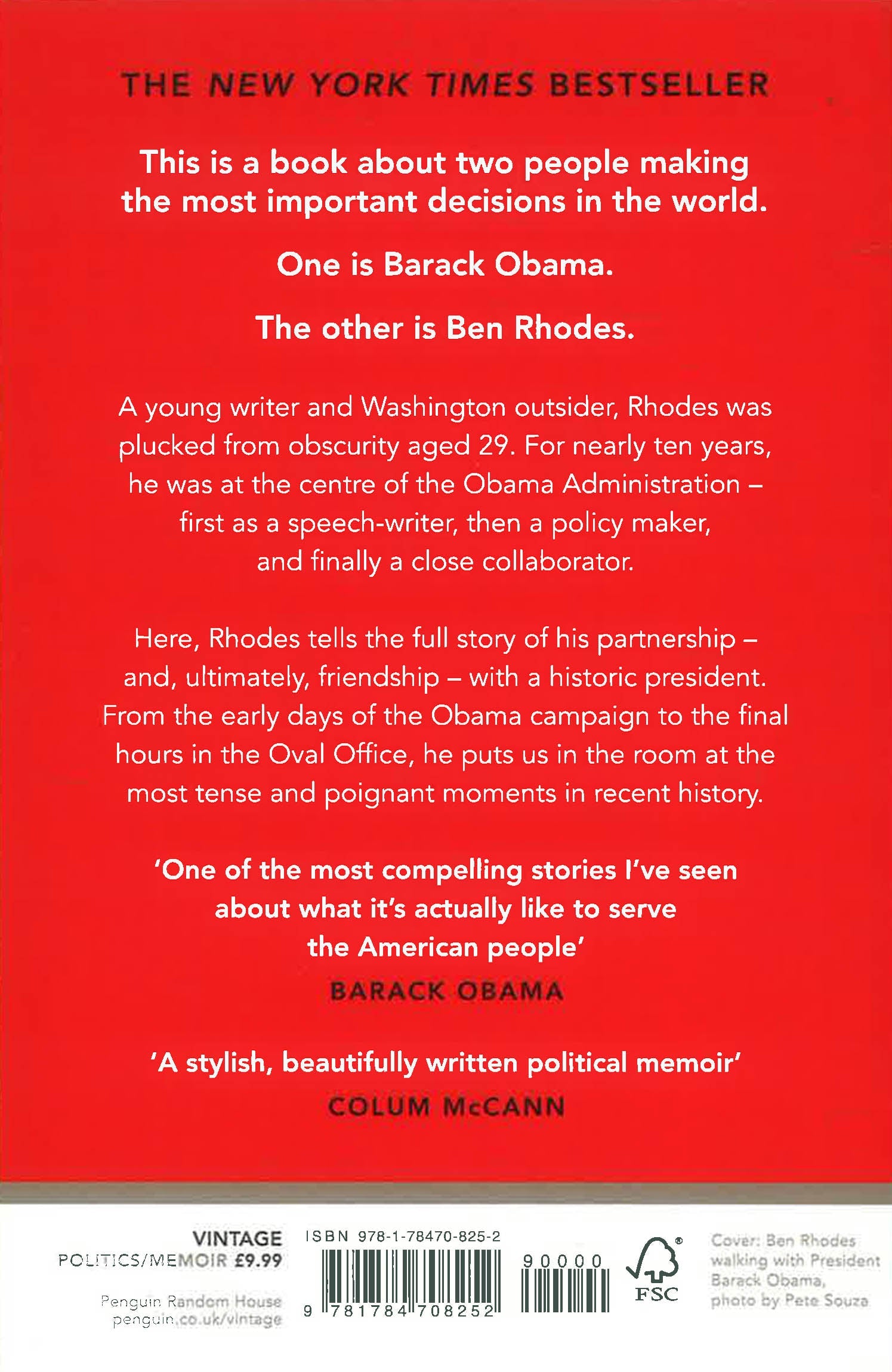 Here, Rhodes tells the full story of his partnership – and, ultimately, friendship – with a historic president. From the early days of the Obama campaign to the final hours in the Oval Office, he puts us in the room at the most tense and poignant moments in recent history.