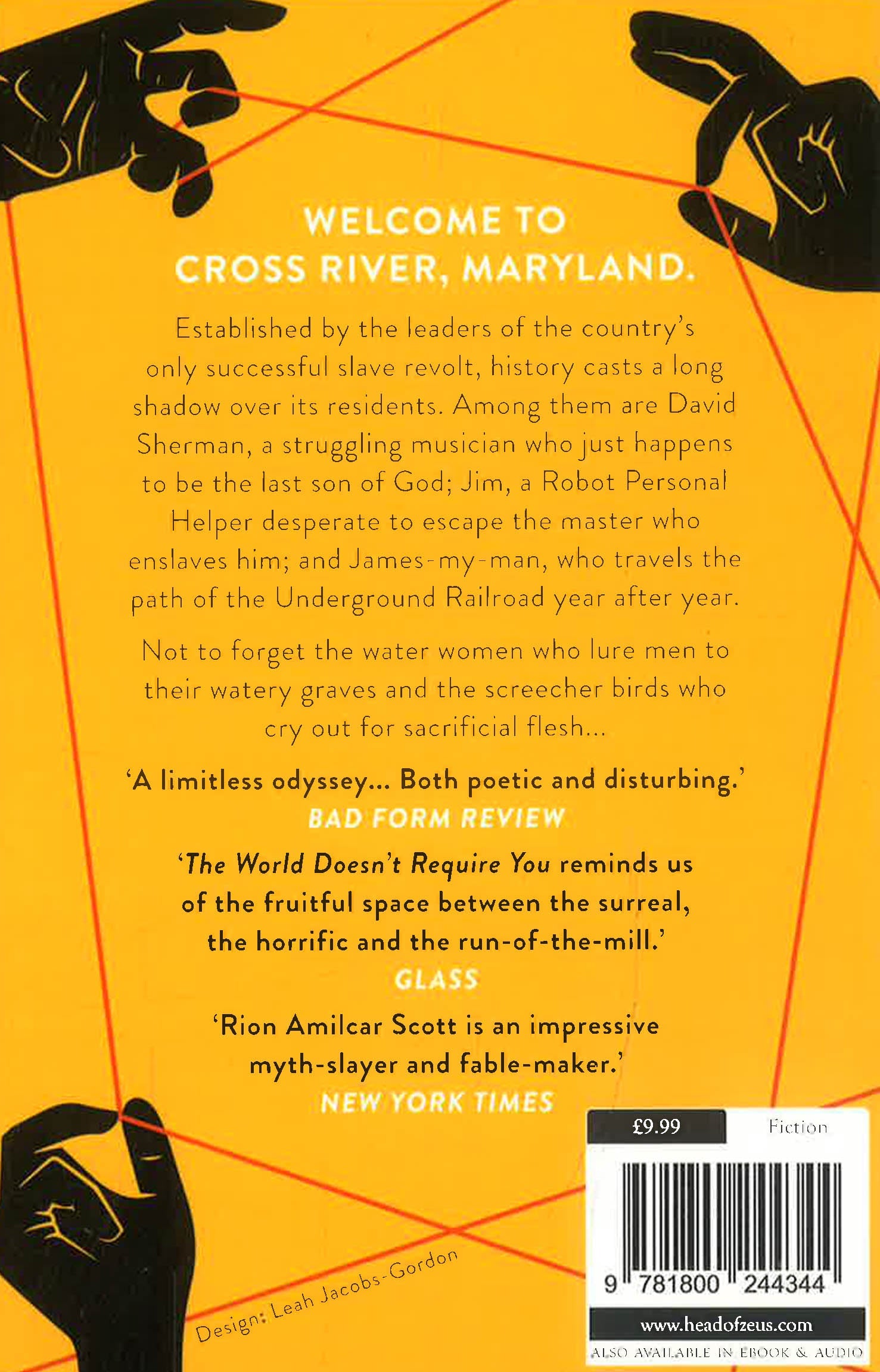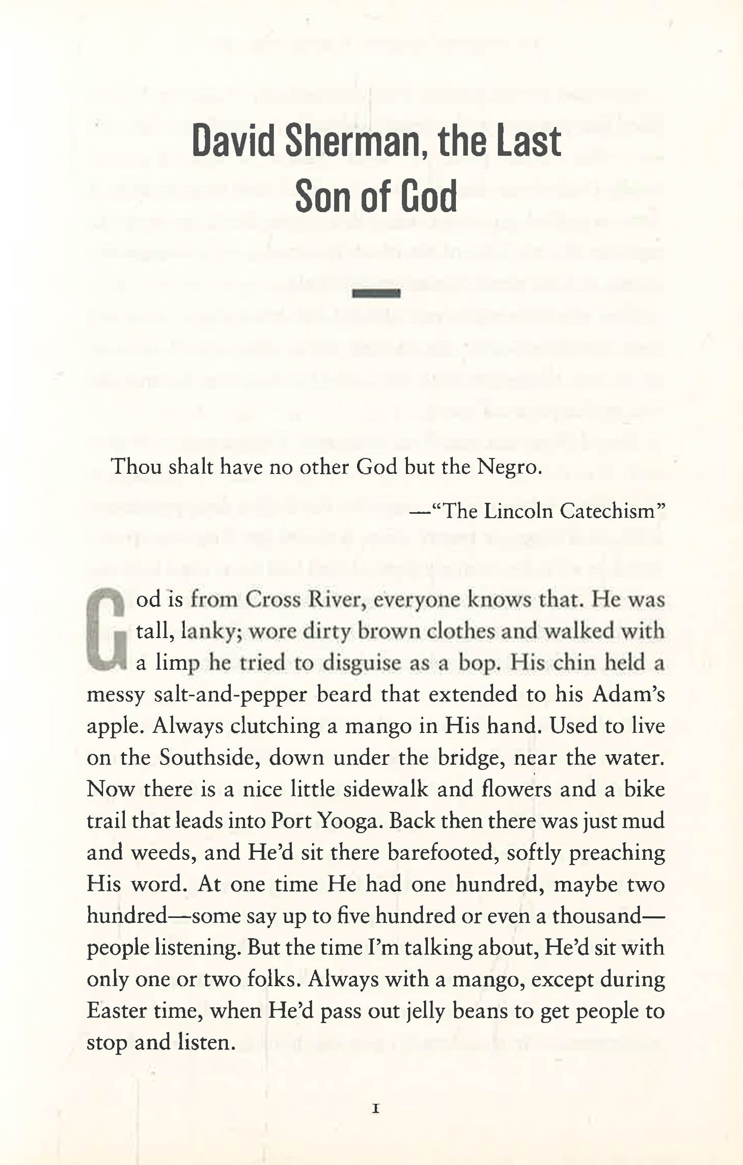 Welcome to Cross River, Maryland. Established by the leaders of the country's only successful slave revolt, history casts a long shadow over its residents. Among them are David Sherman, a struggling musician who just happens to be the last son of God; Jim, a Robot Personal Helper desperate to escape the master who enslaves him; and James-my-man, who travels the path of the Underground Railroad year after year.