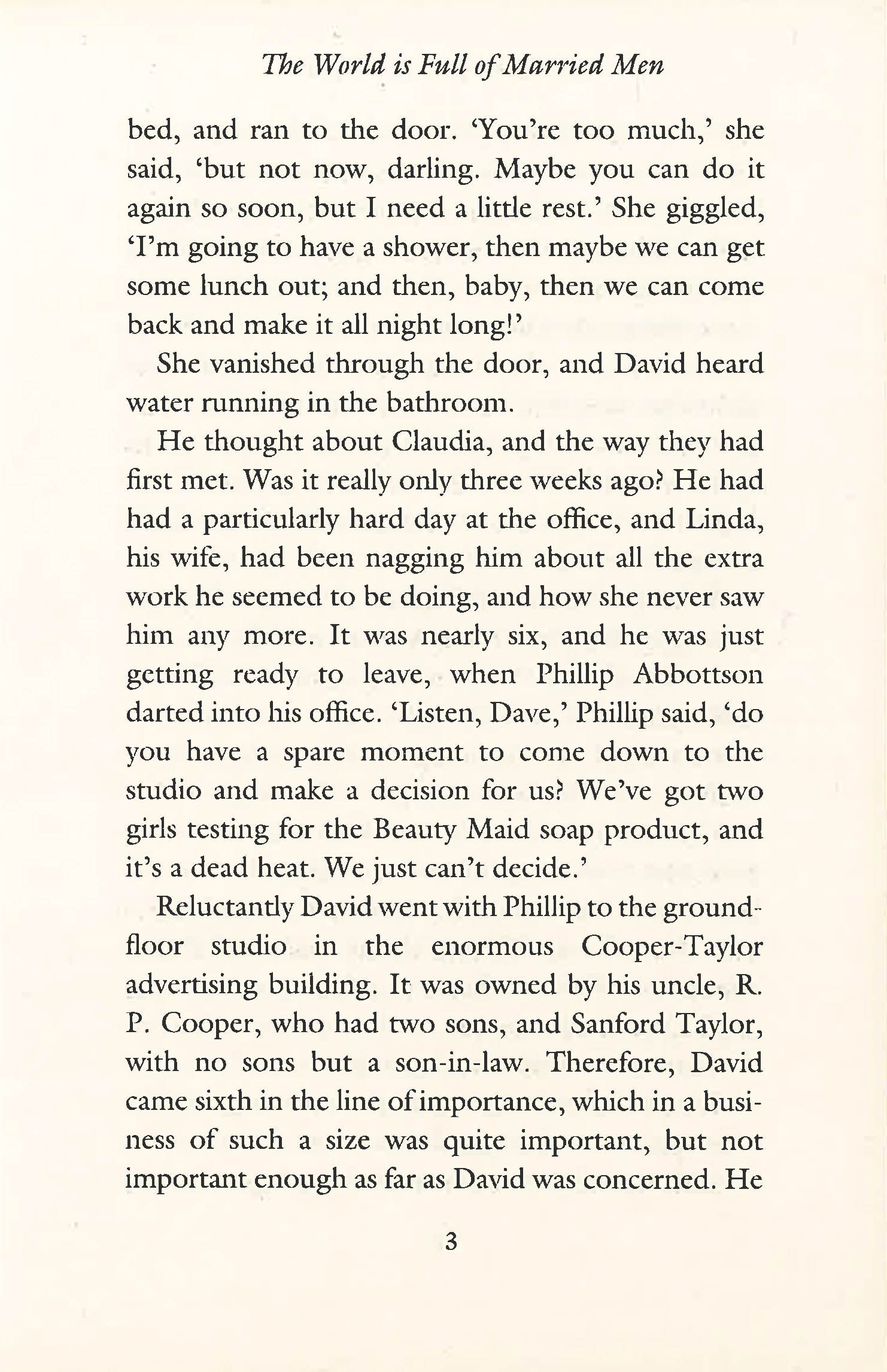 David Cooper cheats on his wife. She doesn't cheat - and that suits him fine. Until the young and beautiful Claudia appears and David wants out of his marriage. But Claudia has different ideas - different dreams: To be a model, an actress, a star. And she'll do anything to make it. Just name a price. The world is full of married men is a devastating exposure of the cut throat media business - the phony promises and the very real power of the casting couch.