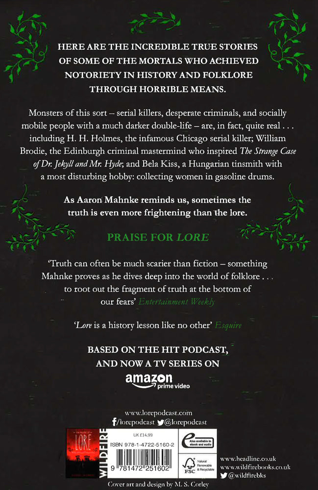 A chilling, lavishly illustrated who's-who of the most despicable people ever to walk the earth, featuring both rare and best-loved stories from the hit podcast Lore, now an online streaming series. Here are the incredible true stories of some of the mortals who achieved notoriety in history and folklore through horrible means. Monsters of this sort - serial killers, desperate criminals, and socially mobile people with a much darker double-life - are, in fact, quite real . . . including H. H. Holmes, the infamous Chicago serial killer; William Brodie, the Edinburgh criminal mastermind who inspired The Strange Case of Dr. Jekyll and Mr. Hyde; and Bela Kiss, a Hungarian tinsmith with a most disturbing hobby: collecting women in gasoline drums.As Aaron Mahnke reminds us, sometimes the truth is even scarier than the lore.