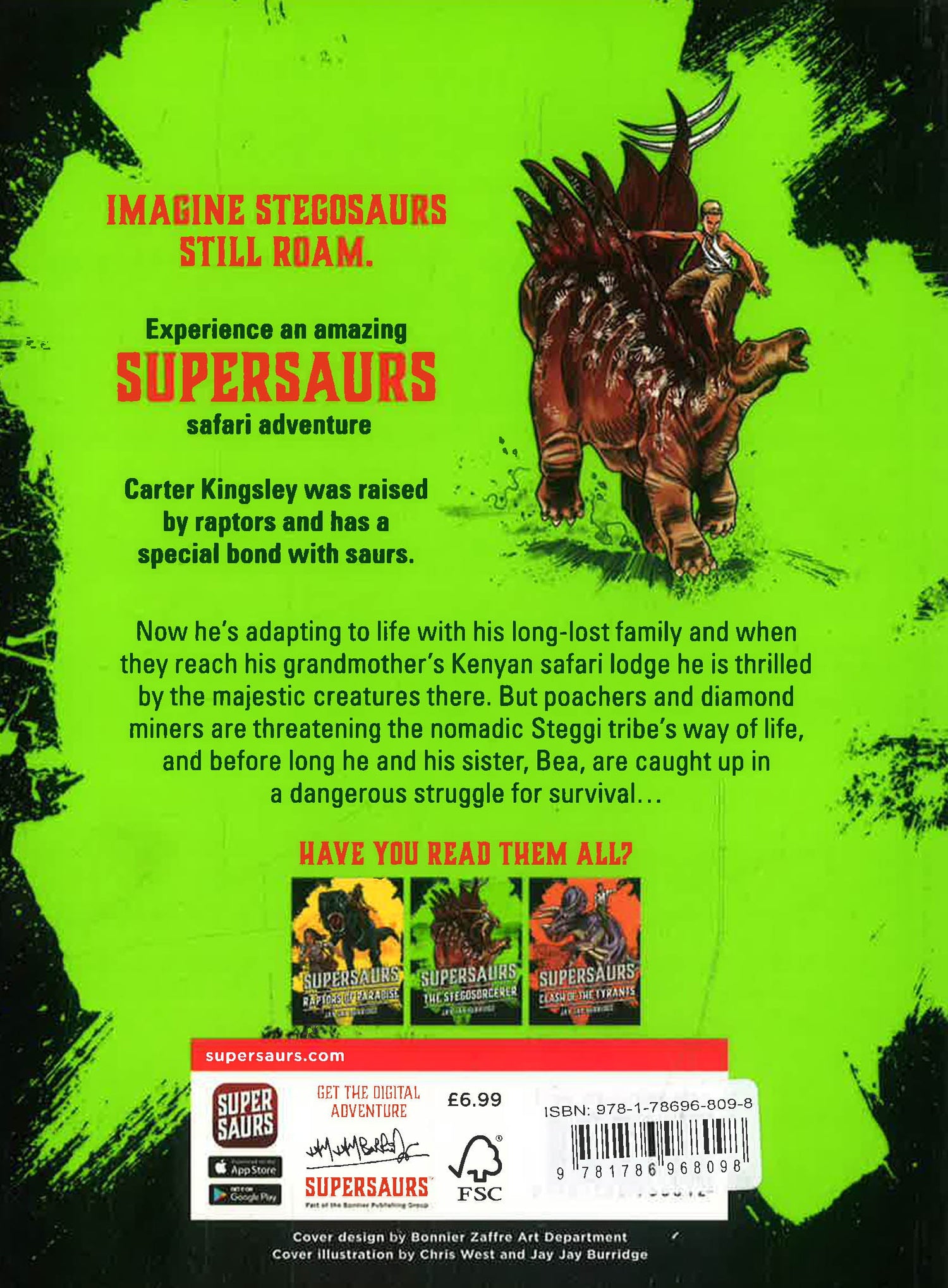 The next book in the innovative adventure series. Imagine a world where dinosaurs never died out . . the world of Supersaurs. After leaving the rainforests of Indonesia, and outwitting the terrible Christian Hayter, Bunty Brownlee takes her grandchildren Bea and Carter, and Carter's newly domesticated Black Dwarf Tyrant, to a safari reserve in Kenya, built to protect the endangered White Titan Tyrants. But soon the children are caught up in a sinister plot involving poaching and diamond-mining. The young heroes require the aid of the Steggi, a nomadic tribe who live in harmony with their prized Stegosaurs... Packed with revelations, and with more clues to uncover via the Augmented Reality app, this thrilling African safari adventure takes the reader deeper into the wonderful world of Supersaurs.