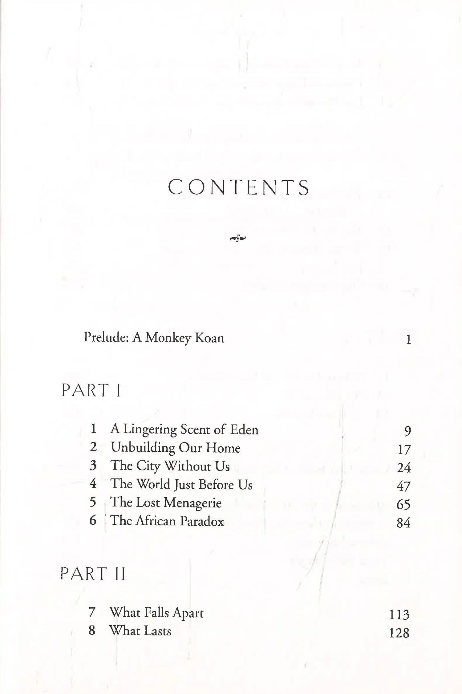 Just days after humans disappear, floods in New York's subways would start eroding the city's foundations and the world's cities would crumble, asphalt jungles giving way to real ones. Drawing on the expertise of engineers, atmospheric scientists, art conservators, zoologists, oil refiners, marine biologists, astrophysicists, religious leaders from rabbis to the Dalai Lama, and paleontologists, who describe a prehuman world inhabited by megafauna (like giants sloths that stood taller than mammoths), Weisman illustrates what the planet might be like today, if not for us.