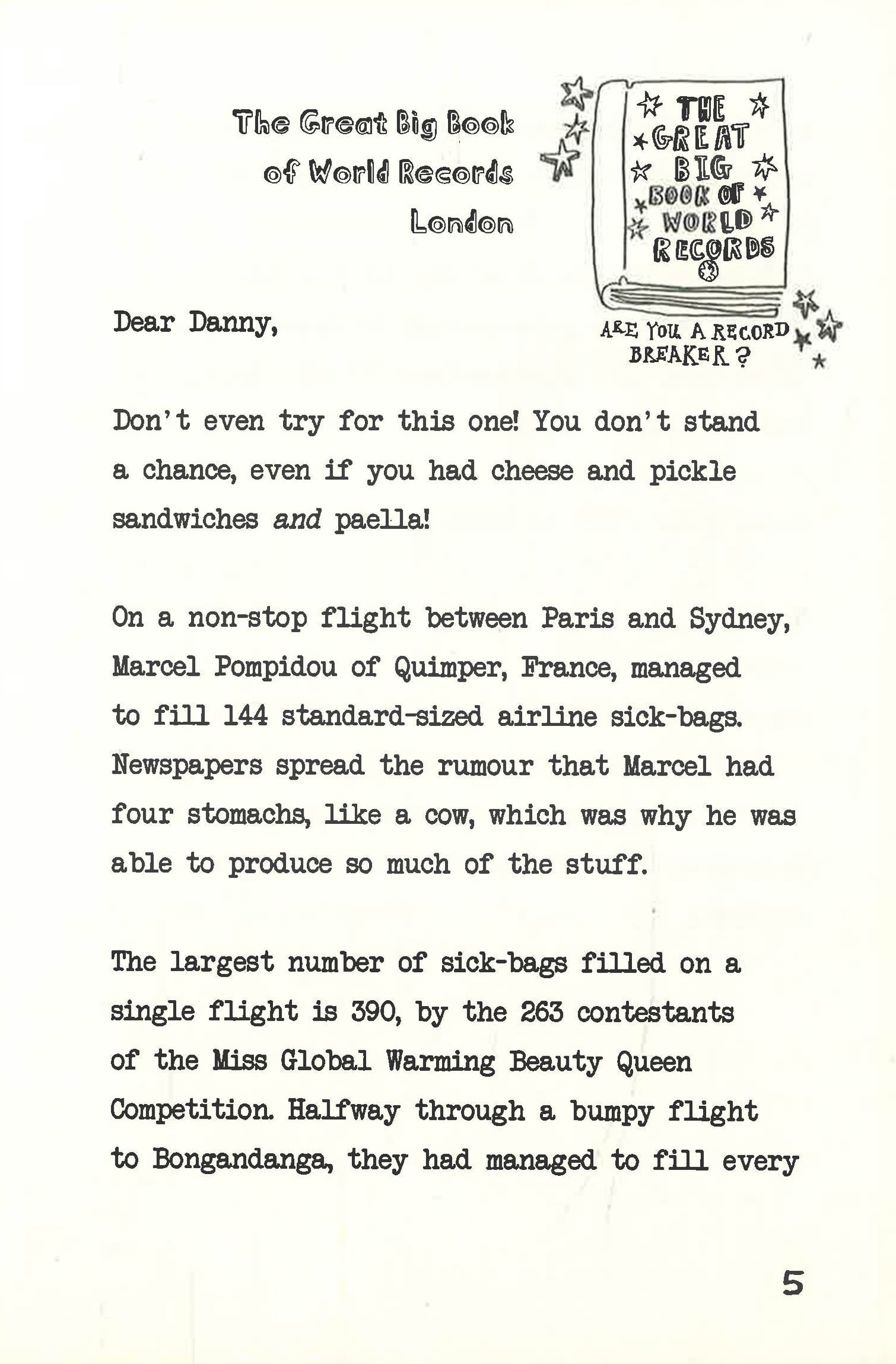 In this book, Danny is going on holiday! He will attempt to break the following records. Drumroll, please. . .