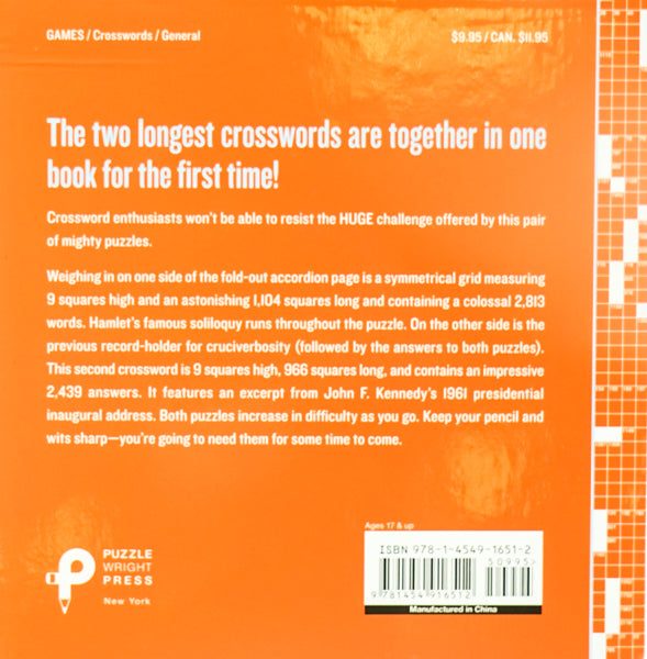 The two longest crosswords ever created - now together for the first time! Amazingly, in spite of their massive size, these puzzles follow the rules of standard American crosswords: full interlock, no repeated answers, symmetrical patterns of black squares, and no one - or two-letter words. Running through one of the puzzles is Hamlet's famous "To be or not to be" speech, while the other features an excerpt from JFK's inaugural address. With more than 46 feet of puzzle to work on, these will keep solvers busy for weeks, months, and even years.