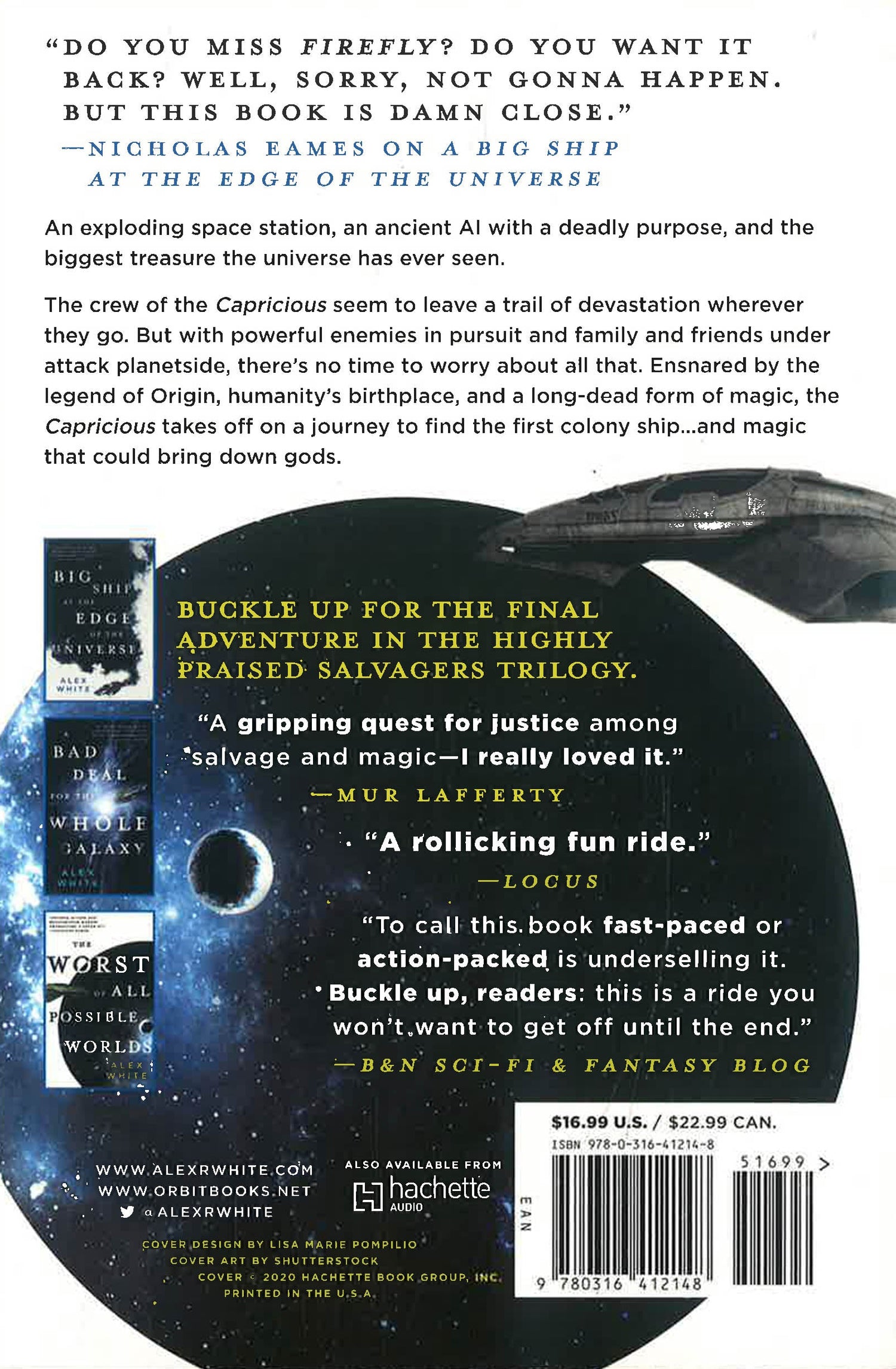 The rag-tag crew of the Capricious is hunting down rogue AI, ancient colony ships, and the biggest treasure the universe has ever seen in the final book of this pulse-pounding space adventure series for fans of Firefly and The Expanse. The crew of the Capricious seems to leave a trail of devastation wherever they go. But with powerful enemies in pursuit and family and friends under attack planetside, there's no time to worry about all that. Ensnared by the legend of Origin, humanity's birthplace, and a long-dead form of magic, the Capricious takes off on a journey to find the first colony ship...and magic that could bring down gods. Read the incredible space-fantasy series that V. E. Schwab calls 'A total blast!'The SalvagersA Big Ship at the Edge of the UniverseA Bad Deal for the Whole GalaxyThe Worst of All Possible Worlds