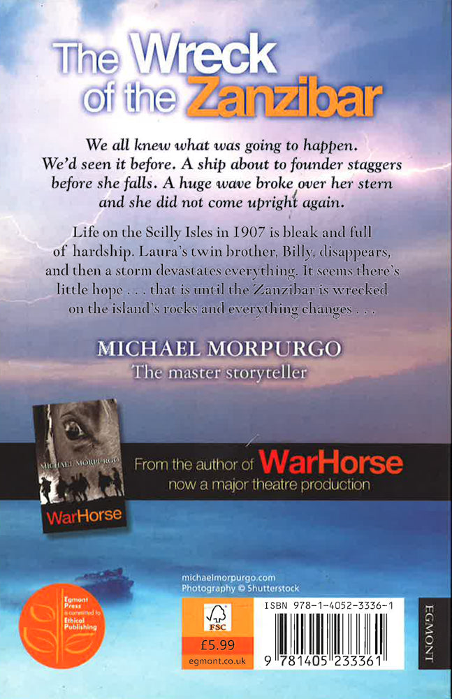 A gripping children's story from War Horse author and former Children's Laureate Michael Morpurgo.A gripping children's story from War Horse author and former Children's Laureate Michael Morpurgo. "We all knew what was going to happen. We'd seen it before. A ship about to founder staggers before she falls. A huge wave broke over her stern and she did not come upright again.... Life on the Scilly Isles in 1907 is bleak and full of hardship. Laura's twin brother, Billy, disappears, and then a storm devastates everything. It seems there's little hope. But then the Zanzibar is wrecked on the island's rocks, and everything changes ... The Wreck of the Zanzibar is a gripping historical adventure from the author of An Eagle in the Snow, Listen to the Moon, Shadow, and An Elephant in the Garden. Michael Morpurgo has written more than one hundred books for children and won the Whitbread Award, the Smarties Award, the Circle of Gold Award, the Children's Book Award and has been short-listed for the Carnegie Medal four times.