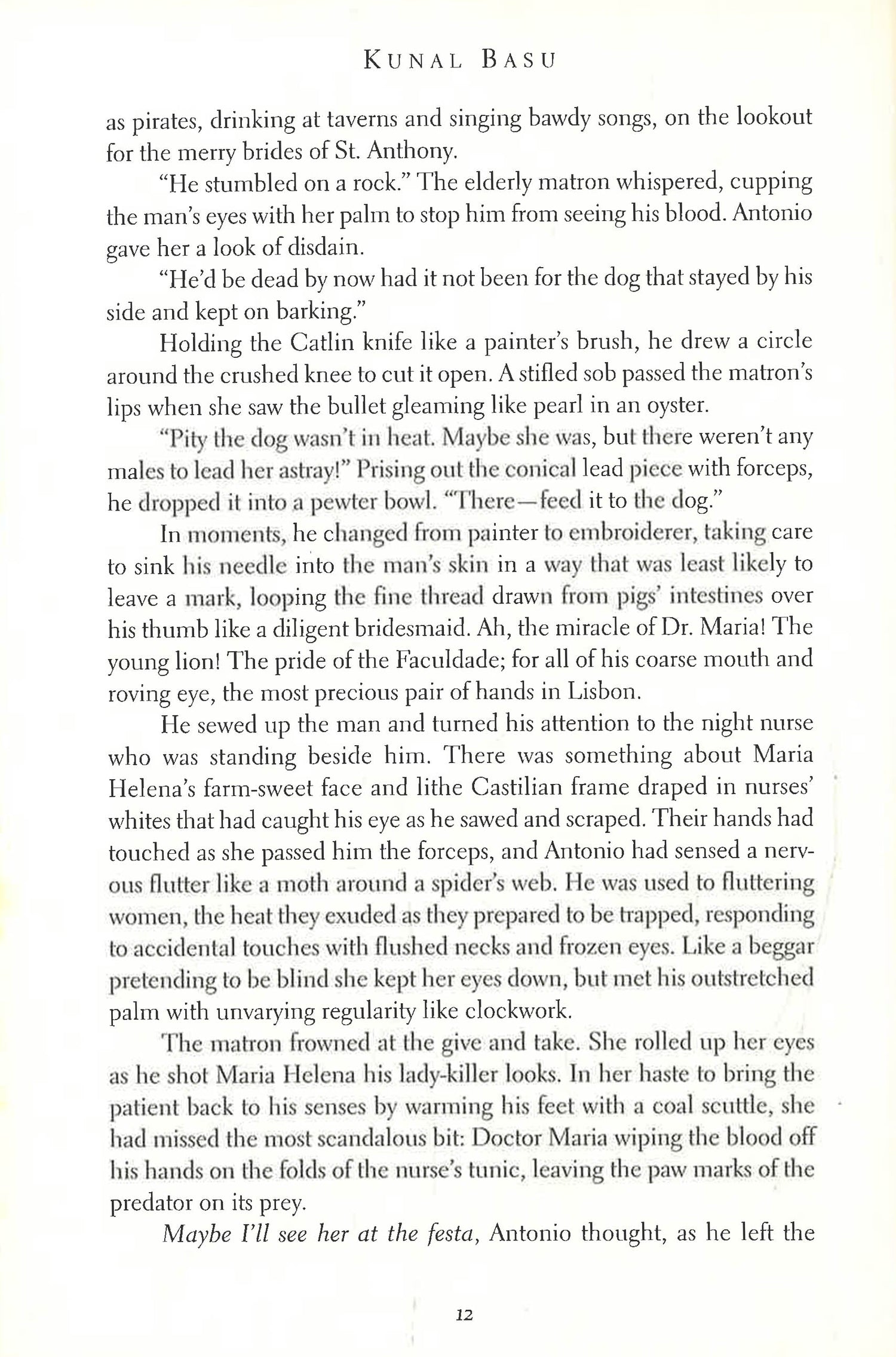 Lisbon, 1898: Antonio Maria, surgeon and notorious playboy, returns home after a long absence to learn his beloved father has syphilis, the scourge of both rich and poor. Determined to find a cure, Antonio sets sail for Peking, to study under the evasive but renowned Dr. Xu. But Dr. Xu does not intend to give away his knowledge, and Antonio suddenly falls in love with his assistant, the elusive Fumi. The threat of the advancing Boxer rebellion hangs over the Summer Palace, and Antonio and Fumi must decide whether to flee together or remain in China. Kunal Basu's lush, haunting tale invites comparisons to Michael Ondaatje's best work. This superb novel conjures a man discovering the love that will force him to question everything.