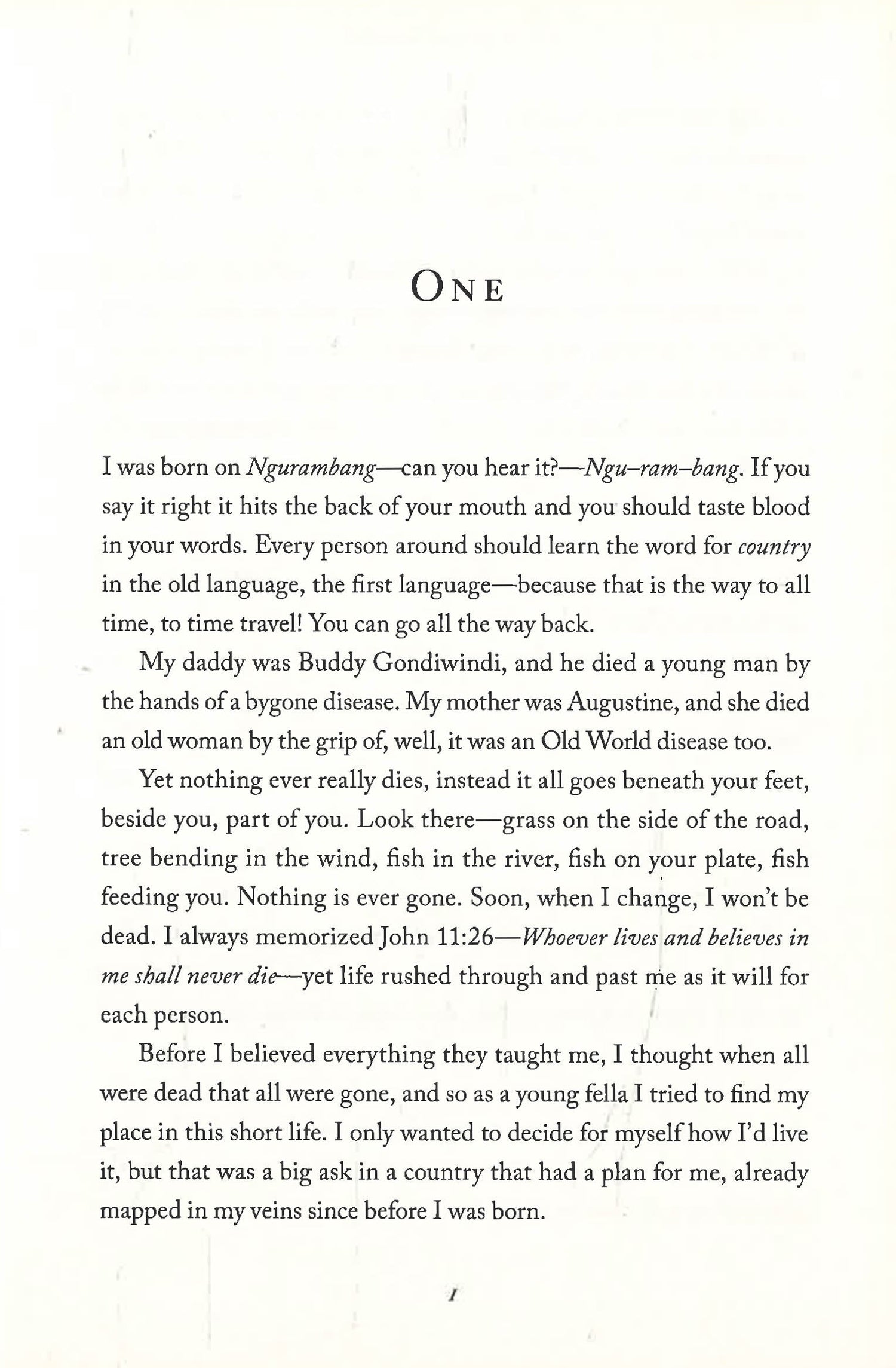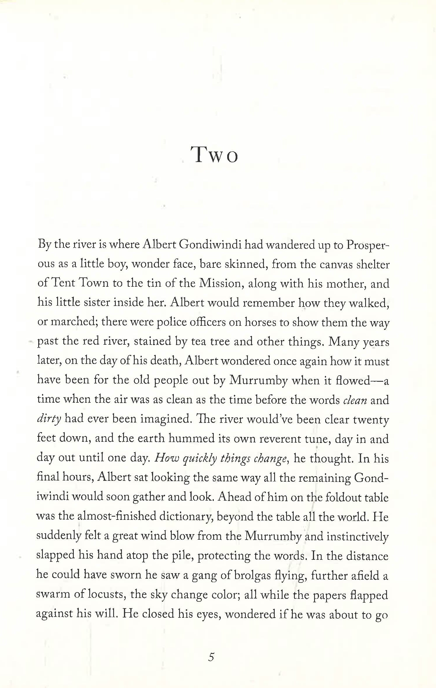 Knowing that he will soon die, Albert "Poppy" Gondiwindi has one final task he must fulfill. A member of the indigenous Wiradjuri tribe, he has spent his adult life in Prosperous House and the town of Massacre Plains, a small enclave on the banks of the Murrumby River. Before he takes his last breath, Poppy is determined to pass on the language of his people, the traditions of his ancestors, and everything that was ever remembered by those who came before him. The land itself aids him; he finds the words on the wind.