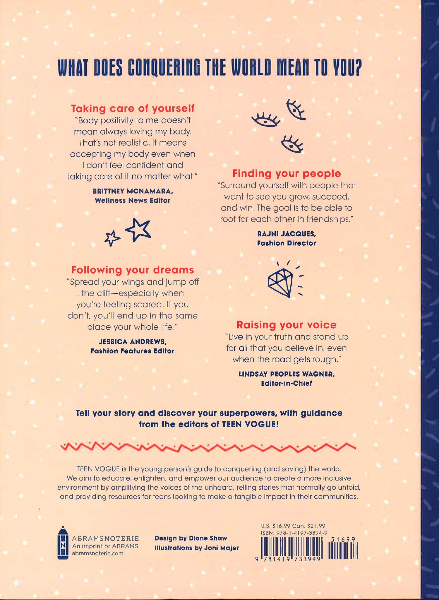A guided journal from Teen Vogue, inspiring young adults to take charge of their lives and see themselves as leaders. Teen Vogue is on a mission to be &;the young person&;s guide to conquering (and saving) the world&; by elevating the voices of teens and the issues that affect their daily lives. This guided journal provides an empowering space for teenagers to start the process of figuring out what they want, what their gifts are, and how they can impact the world. The journal is divided into thematic sections that tackle various facets of young people&;s lives: their goals and ambitions, their relationships, their physical and emotional self-care, and their sense of higher purpose. Inspiring quotes from celebrities are paired with list-making, writing, and Mad Libs-style prompts. Illustrated throughout and representing diverse voices from the Teen Vogue editorial team, the journal&;s overarching message is this: You are the boss of your own life, and the world needs your leadership. Special Features Flexi cover with embossing, spot gloss, and a lay-flat binding Ribbon marker Fully-illustrated throughout A fun, offline space for teenagers to figure out who they are and what they want to say.