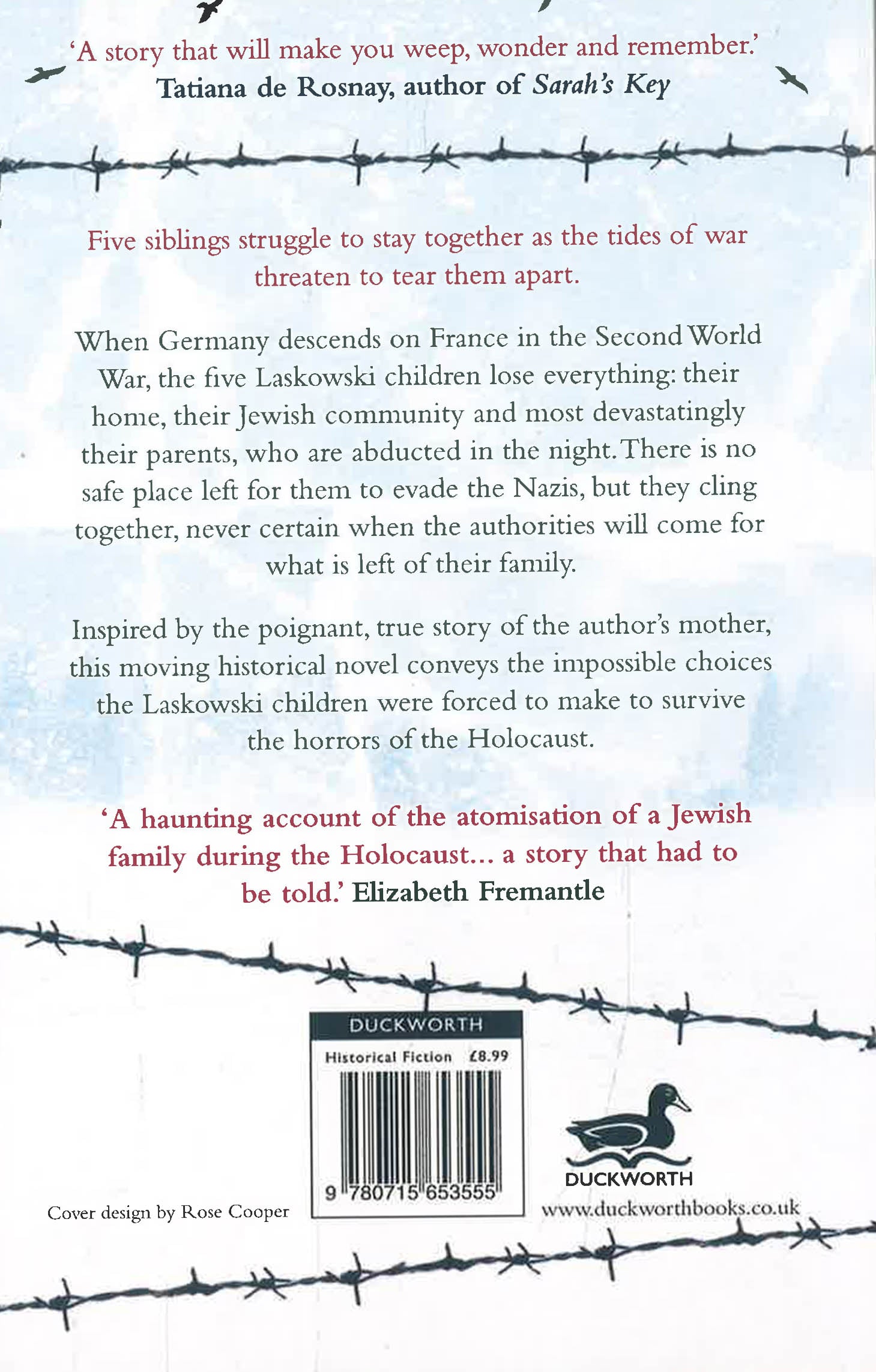 What if everyone you loved was suddenly taken away? Five siblings struggle to stay together as the tides of war threaten to tear them apart. When Germany invades France in the Second World War, the five Laskowski children lose everything: their home, their Jewish community and most devastatingly their parents who are abducted in the night. There is no safe place left for them to evade the Nazis, but they cling together, never certain when the authorities will come for what is left of them. Inspired by the poignant, true story of the author’s mother, this moving historical novel conveys the hardship, the uncertainty and the impossible choices the Laskowski children were forced to make to survive the horrors of the Holocaust.
