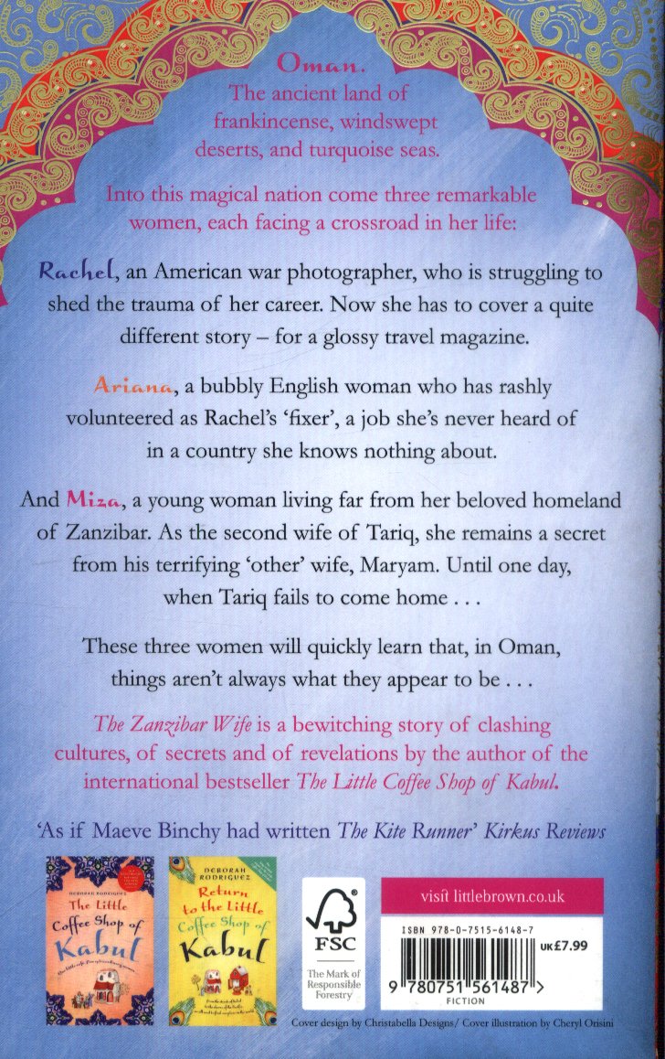 Oman. The ancient land of frankincense, wind-swept deserts, craggy mountaintops and turquoise seas. Into this magical nation come three remarkable women, each facing a crossroad in her life. Rachel, an American war photographer, who is struggling to shed the trauma of her career. Now she is headed to Oman to cover quite a different story - for a glossy travel magazine. Ariana Khan, a bubbly English woman who has rashly volunteered as Rachel's 'fixer', a job she's never heard of in a country she knows nothing about. And Miza, a young woman living far from her beloved homeland of Zanzibar. As the second wife of Tariq, she remains a secret from his terrifying 'other' wife, Maryam. Until the day that Tariq fails to come home... As the three women journey together across this extraordinary land, they quickly learn that, in Oman, things aren't always what they appear to be... The Zanzibar Wife is a bewitching story of clashing cultures and conflicting beliefs, of secrets and revelations, of mystery and magic, by the author of the beloved international bestseller The Little Coffee Shop of Kabul.