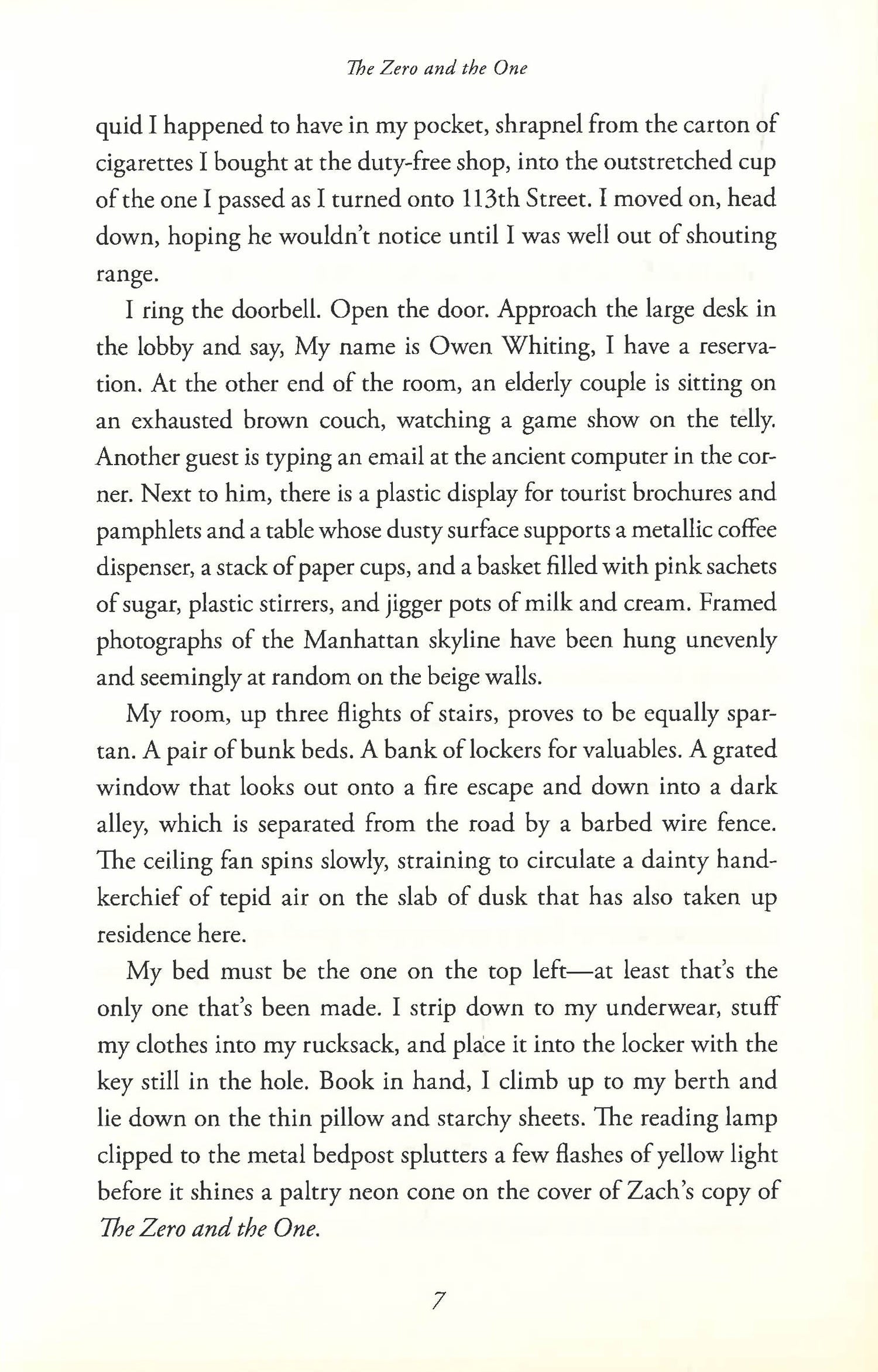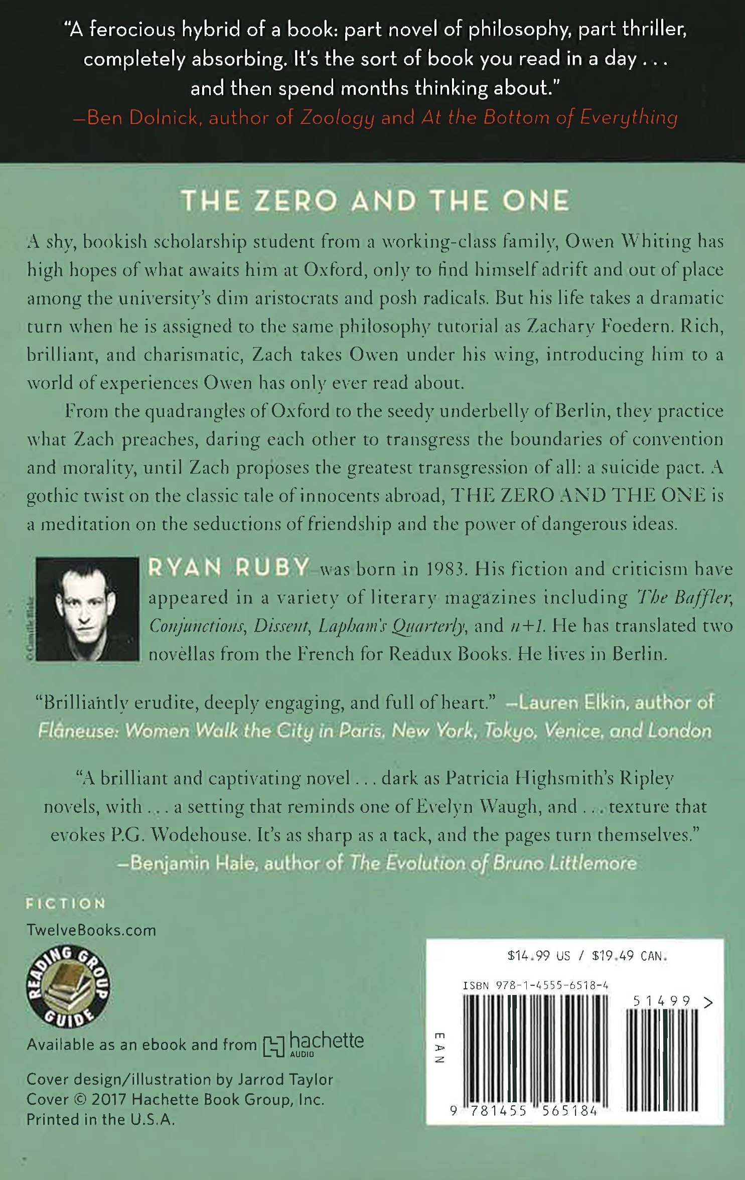 A gothic twist on the classic tale of innocents abroad, THE ZERO AND THE ONE is a meditation on the seductions of friendship and the power of dangerous ideas that registers the dark, psychological suspense of Patricia Highsmith's The Talented Mr. Ripley and the intellectual and philosophical intrigue of John Banville's The Book of Evidence.A shy, bookish scholarship student from a working-class family, Owen Whiting has high hopes of what awaits him at Oxford, only to find himself adrift and out of place among the university's dim aristocrats and posh radicals. But his life takes a dramatic turn when he is assigned to the same philosophy tutorial as Zachary Foedern, a visiting student from New York City. Rich, brilliant, and charismatic, Zach takes Owen under his wing, introducing him to a world of experiences Owen has only ever read about. From the quadrangles of Oxford to the seedy underbelly of Berlin, they practice what Zach preaches, daring each other to transgress the boundaries of convention and morality, until Zach proposes the greatest transgression of all: a suicide pact. But when Zach's plans go horribly awry, Owen is left to pick up the pieces in the sleek lofts and dingy dives of lower Manhattan. Now he must navigate the treacherous boundary between illusion and reality if he wants to understand his friend and preserve a hold on his once bright future.
