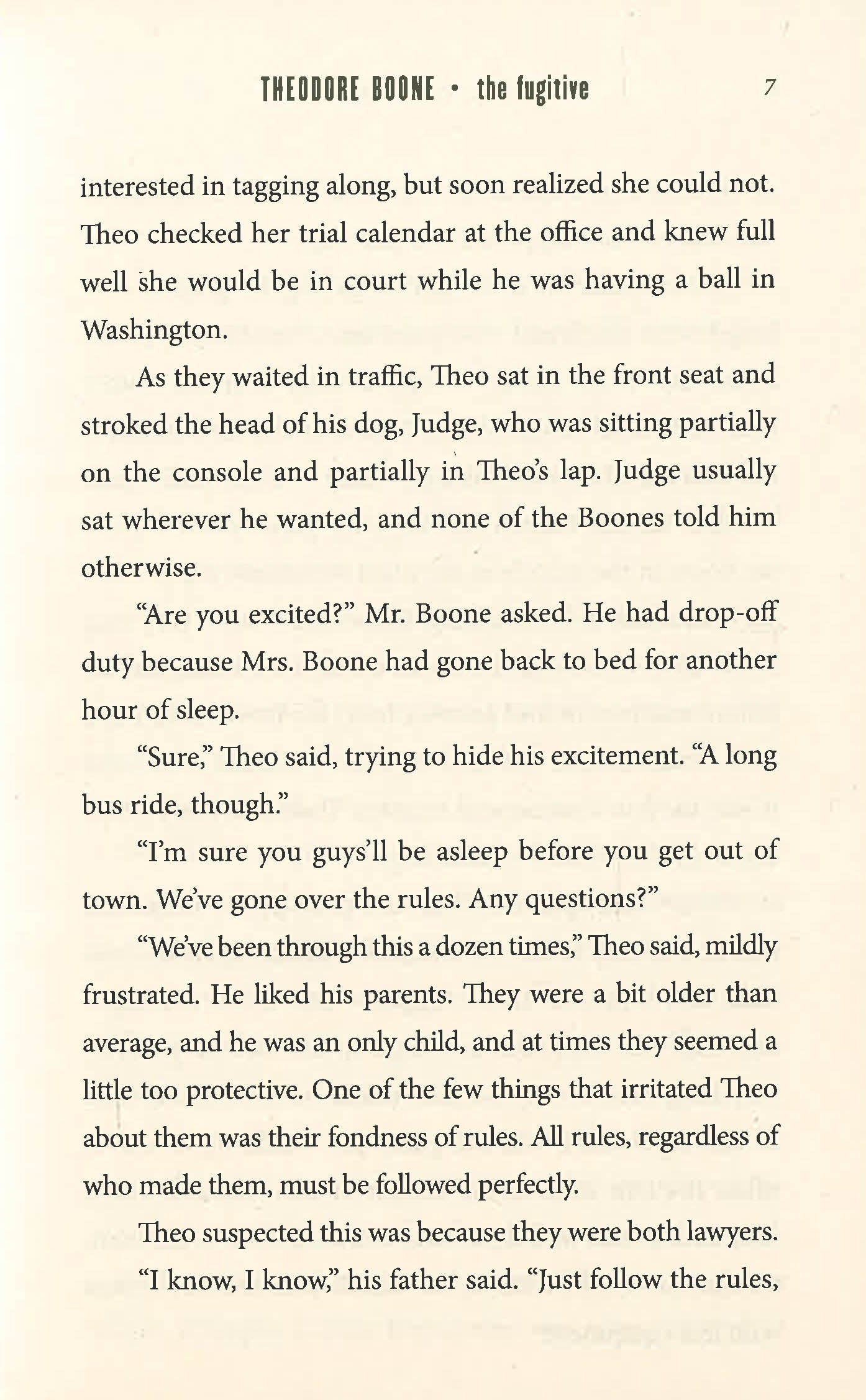 Theo Boone thought the danger had passed, but he's about to face off against an old adversary: accused murderer and fugitive Pete Duffy. On a field trip to Washington, DC, Theo spots a familiar face on the Metro: Duffy, who jumped bail and was never seen again. Theo's quick thinking helps bring Duffy back to Strattenburg to stand trial. But now that Duffy knows who he is, Theo is in greater danger than he's ever been in before. Even when everything is on the line, Theodore Boone will stop at nothing to make sure a killer is brought to justice.