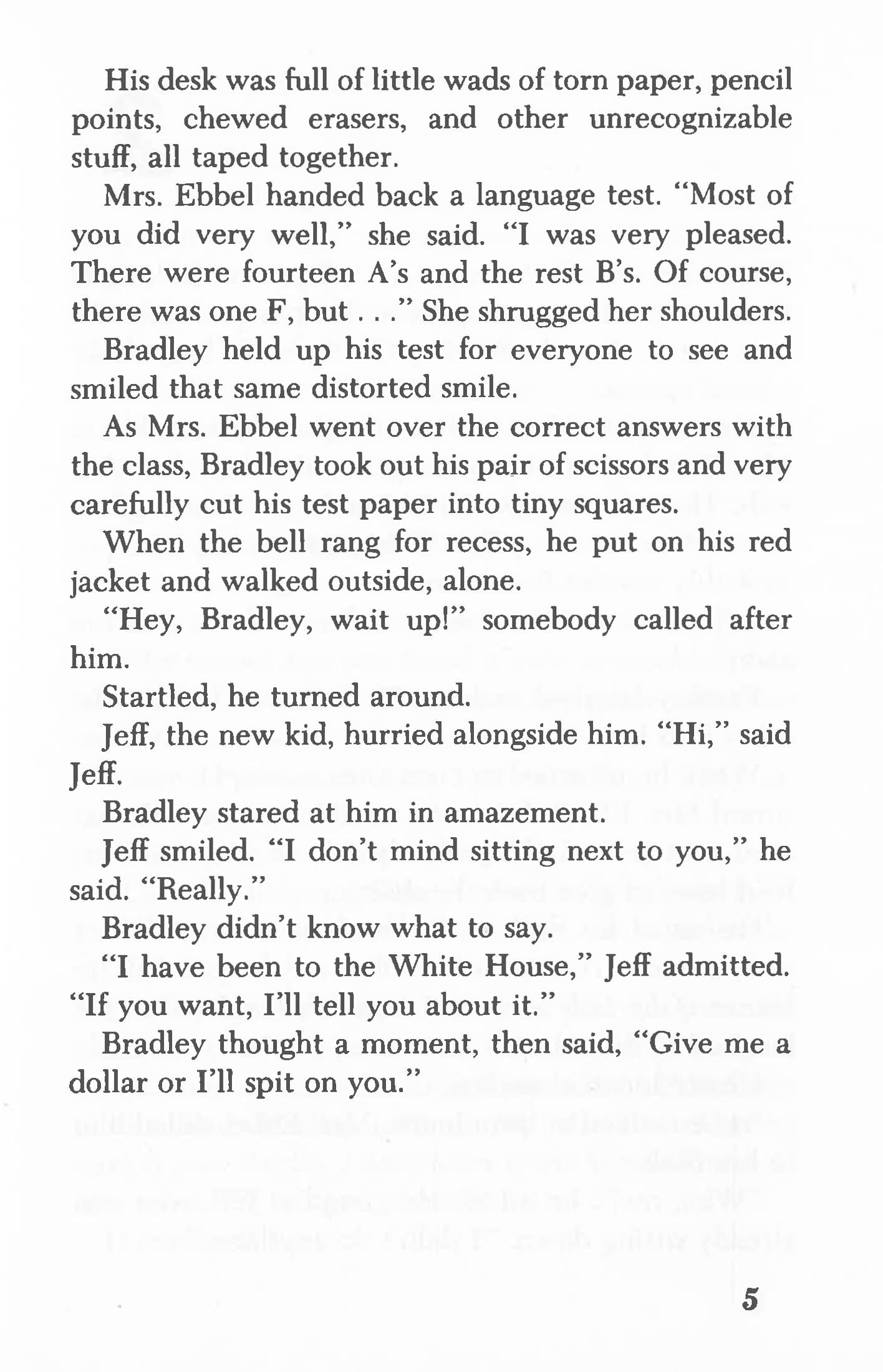 Give me a dollar or I'll spit on you." That's Bradley Chalker for you. He is the oldest child in the class. He tells enormous lies. He picks fights with girls, and the teachers say he has "serious behaviour problems." No one likes him - except Carla, the new school counsellor. She thinks Bradley is sensitive and generous, and she even enjoys his far-fetched stories. Carla knows that Bradley could change, if only he weren't afraid to try. Sometimes the hardest thing in the world is believing in yourself.
