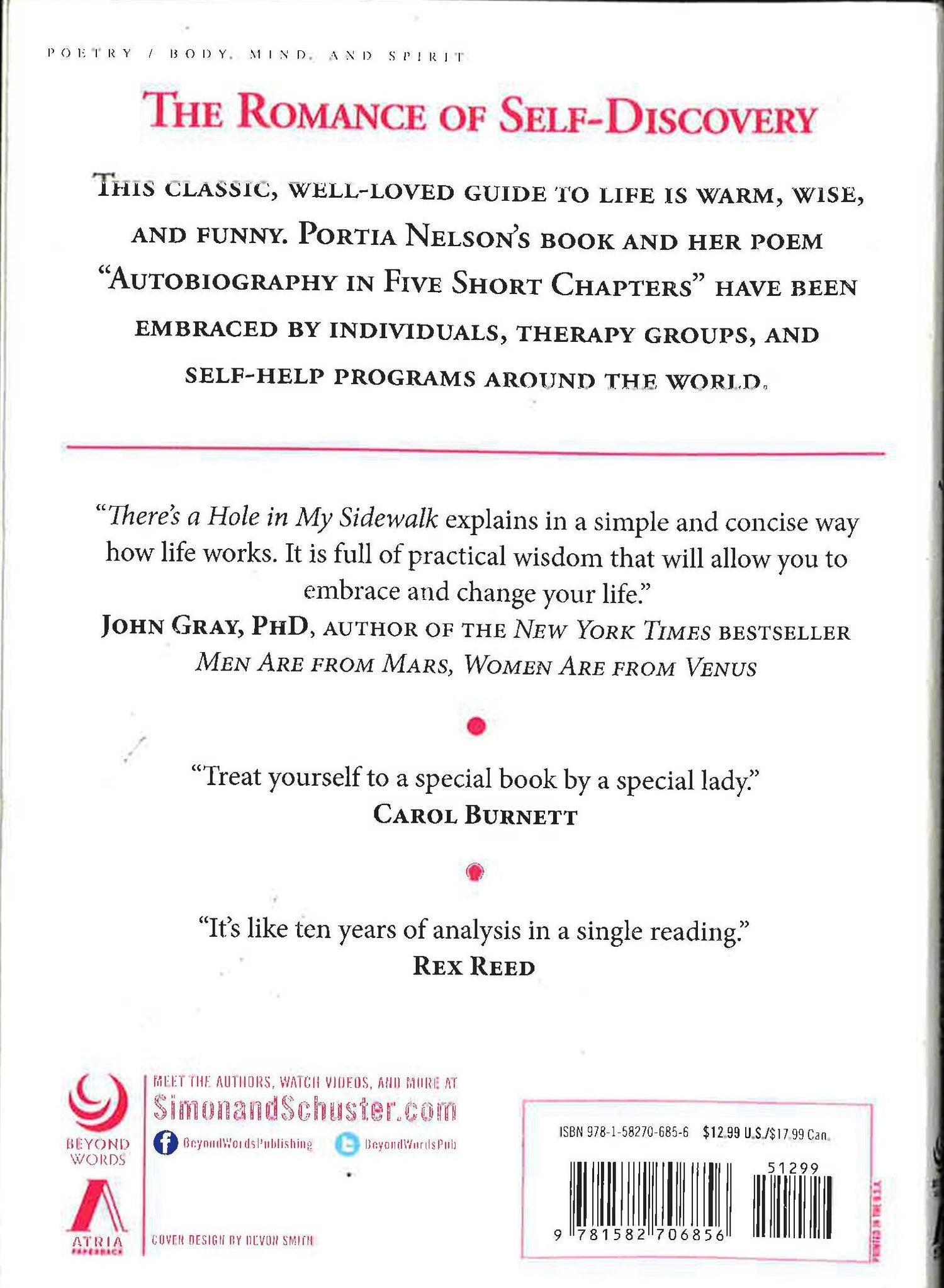 Discover the beloved self-help classic featuring moving poems and insightful truisms that "is full of practical wisdom that will allow you to embrace and change your life" (John Gray, Ph.D., author of Men Are from Mars, Women Are from Venus). Individuals, therapy groups, twelve-step programs, and the self-help community around the world have embraced the late Portia Nelson's brilliant There's a Hole in My Sidewalk. Warm, wise, and funny, her seminal poem "Autobiography in Five Chapters" is a treasured and often quoted motto for anyone seeking to better themselves and their life. "Treat yourself to a special book by a special lady" (Carol Burnett) with this perfect inspirational and motivational gift.
