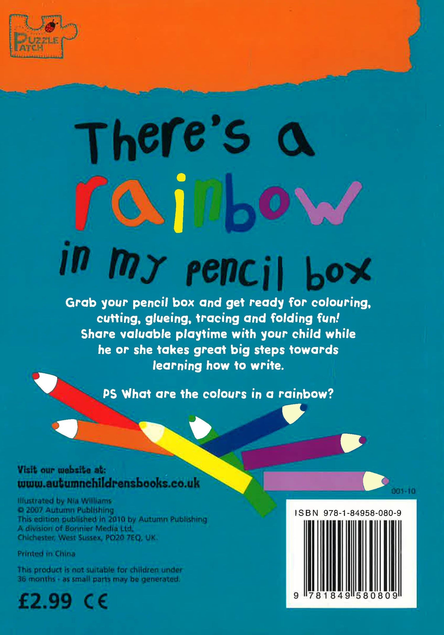 Grab your pencil box and get ready for colouring, cutting, glueing, tracing and folding fun! Share valuable playtime with your child while he or she takes great big steps towards learning how to write. PS. What are the colours in a rainbow?