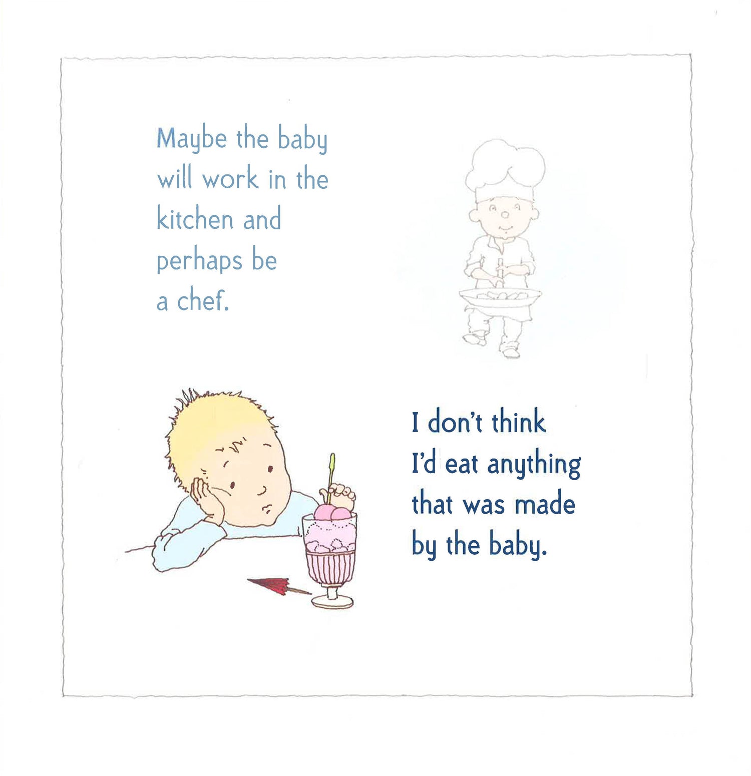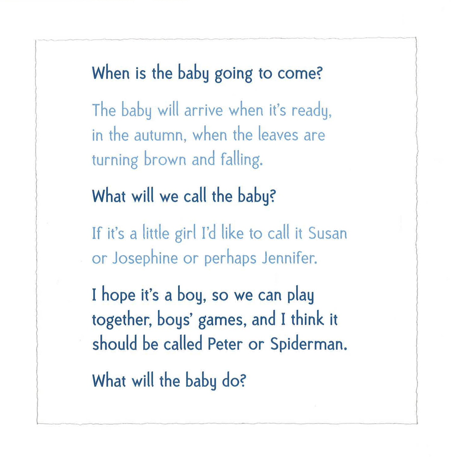 From two of the world's best-loved picture-book creators, an absolute gem for new-siblings-to-be.When is the baby coming? What will we call it? What will the baby do? We don't really need the baby, do we? As the arrival of a new sibling draws nearer, the questions that stream through a young child's mind are followed with sensitivity and humour in this enchanting book. Exquisitely illustrated by Helen Oxenbury, these pages brim with love, excitement and reassurance as the child in the story imagines all kinds of colourful futures for the brother or sister he is waiting to meet. Full of warmth and promise, this is an instant and timeless classic.