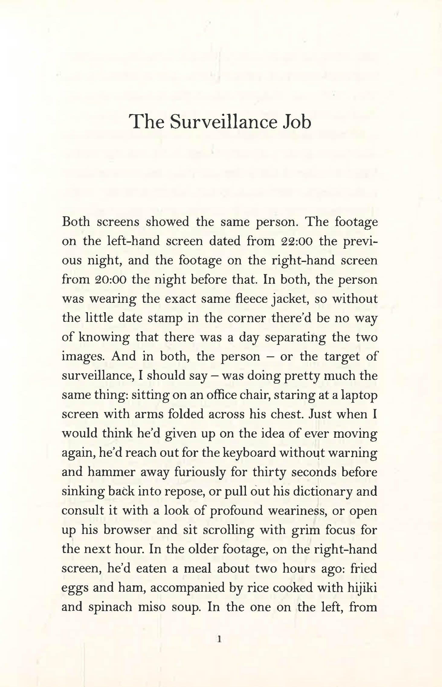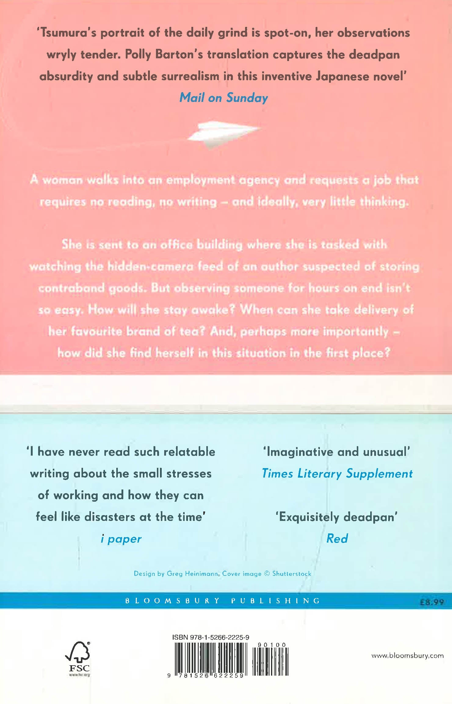 'Surreal and unsettling' OBSERVER CULTURAL HIGHLIGHT ‘Wise, comical and exceptionally relatable’ ZEBA TALKHANI ‘Quietly hilarious and deeply attuned to the uncanny rhythms and deadpan absurdity of the daily grind’ SHARLENE TEO A woman walks into an employment agency and requests a job that requires no reading, no writing – and ideally, very little thinking. She is sent to an office building where she is tasked with watching the hidden-camera feed of an author suspected of storing contraband goods. But observing someone for hours on end isn't so easy. How will she stay awake? When can she take delivery of her favourite brand of tea? And, perhaps more importantly – how did she find herself in this situation in the first place? As she moves from job to job, writing bus adverts for shops that mysteriously disappear, and composing advice for rice cracker wrappers that generate thousands of devoted followers, it becomes increasingly apparent that she’s not searching for the easiest job at all, but something altogether more meaningful...