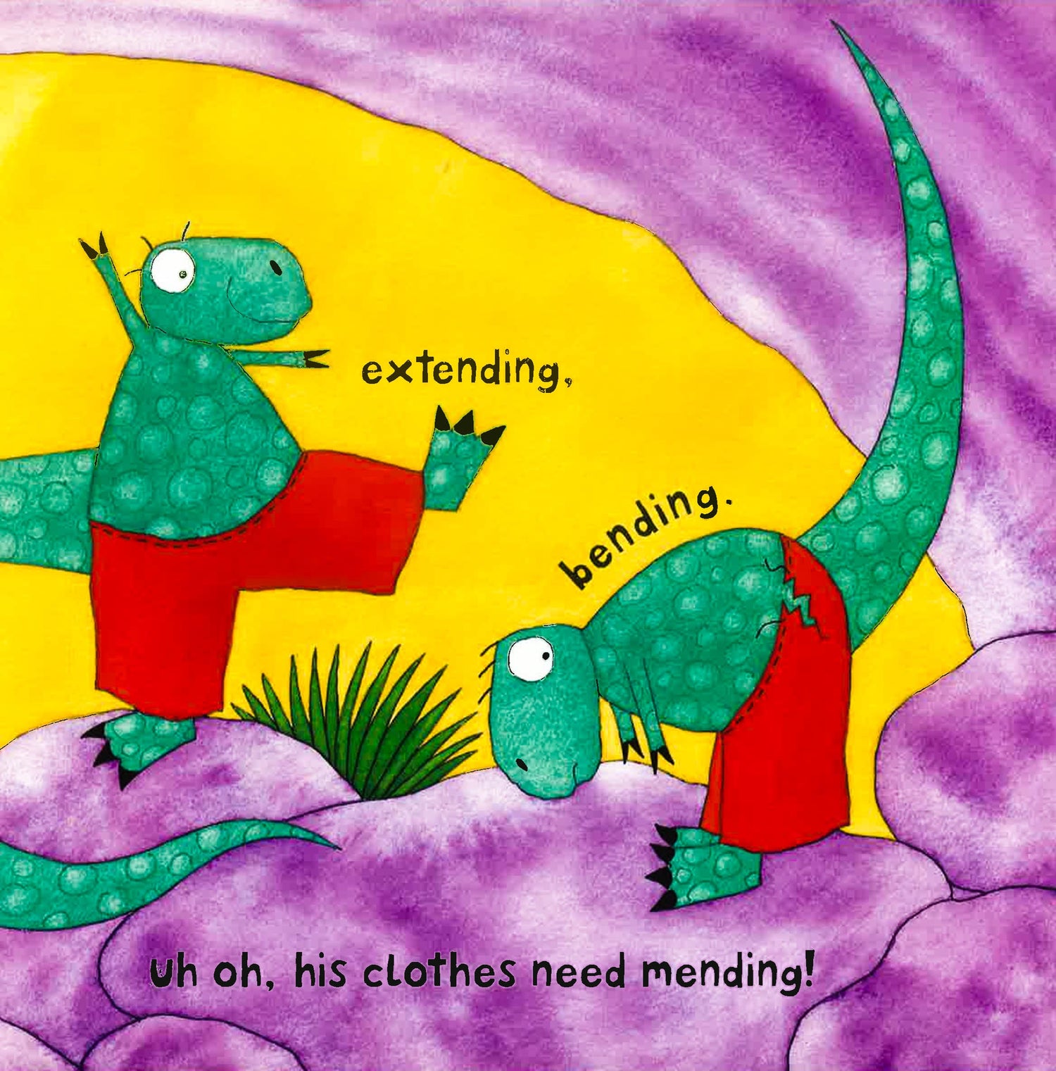 "Thesaurus Rex starts his day stretching, reaching, extending, bending. uh oh, his clothes need mending!"