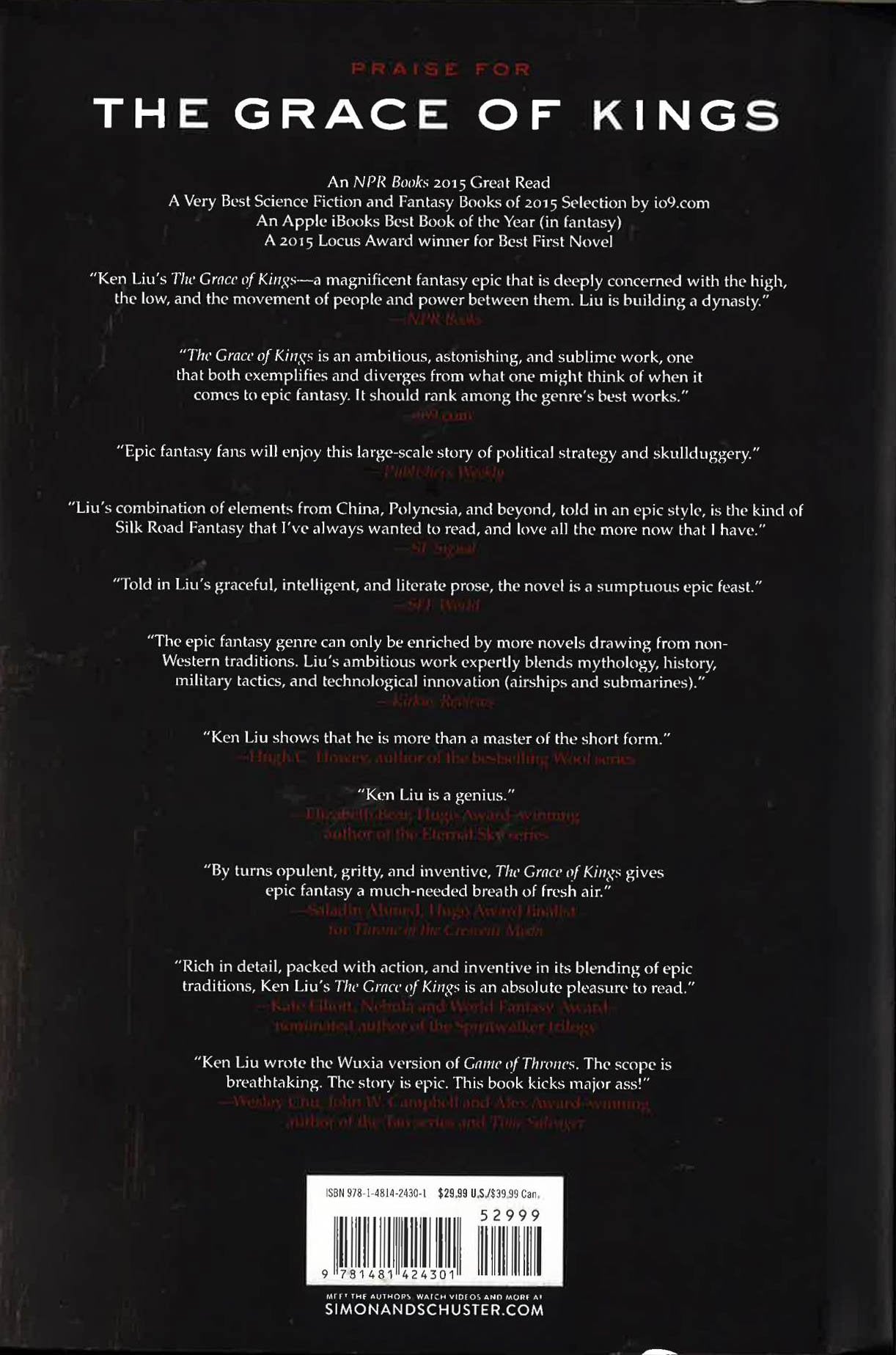 In the much-anticipated sequel to the magnificent fantasy epic (NPR) Grace of Kings, Emperor Kuni Garu is faced with the invasion of an invincible army in his kingdom and must quickly find a way to defeat the intruders. Kuni Garu, now known as Emperor Ragin, runs the archipelago kingdom of Dara, but struggles to maintain progress while serving the demands of the people and his vision. Then an unexpected invading force from the Lyucu empire in the far distant west comes to the shores of Daraand chaos results. But Emperor Kuni cannot go and lead his kingdom against the threat himself with his recently healed empire fraying at the seams, so he sends the only people he trusts to be Daras savvy and cunning hopes against the invincible invaders: his children, now grown and ready to make their mark on history.