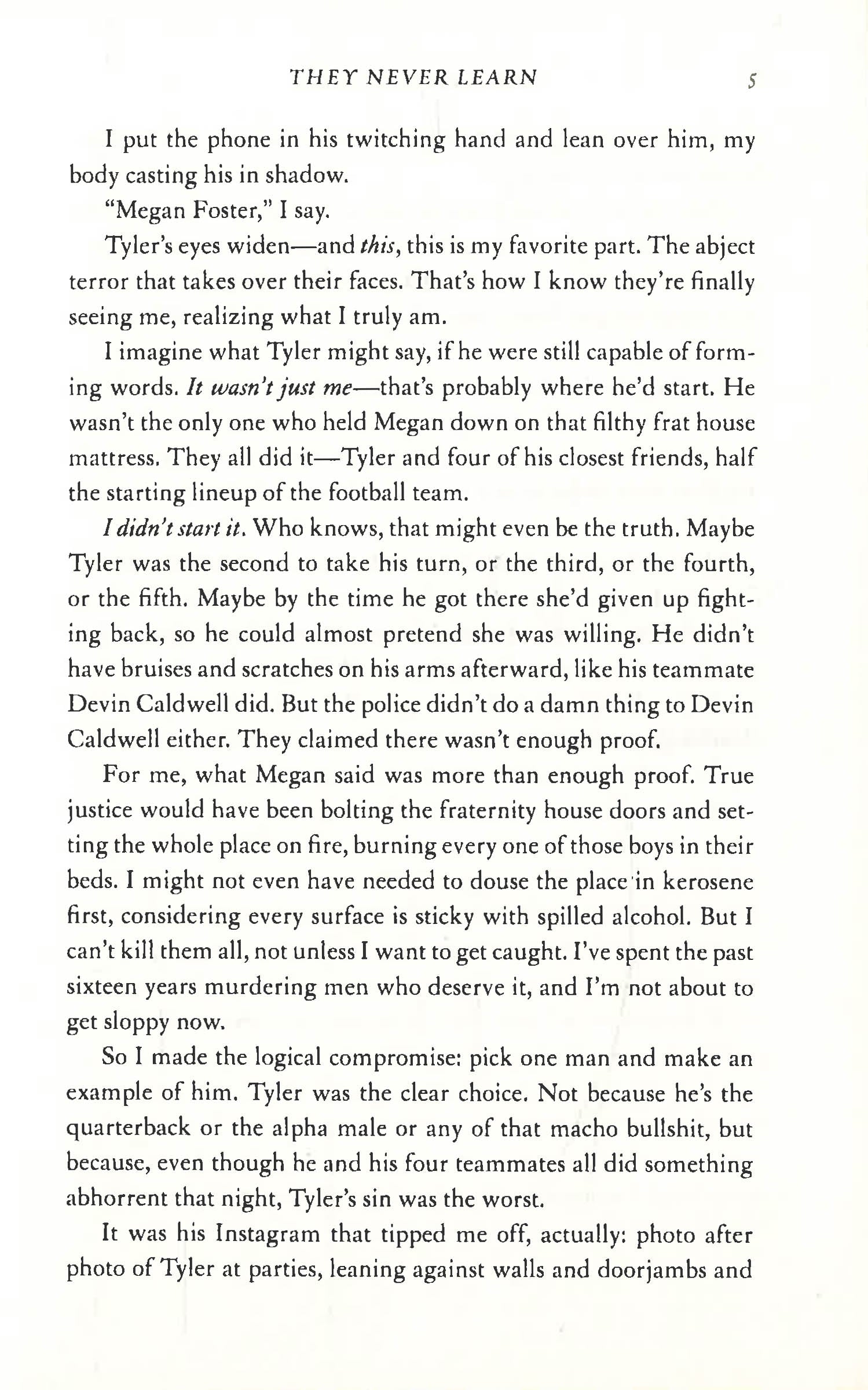 Meanwhile, Gorman student Carly Schiller is just trying to survive her freshman year. Finally free of her emotionally abusive father, all Carly wants is to focus on her studies and fade into the background. Her new roommate has other ideas. Allison Hadley is cool and confident—everything Carly wishes she could be—and the two girls quickly form an intense friendship. So when Allison is sexually assaulted at a party, Carly becomes obsessed with making the attacker pay...and turning her fantasies about revenge into a reality.