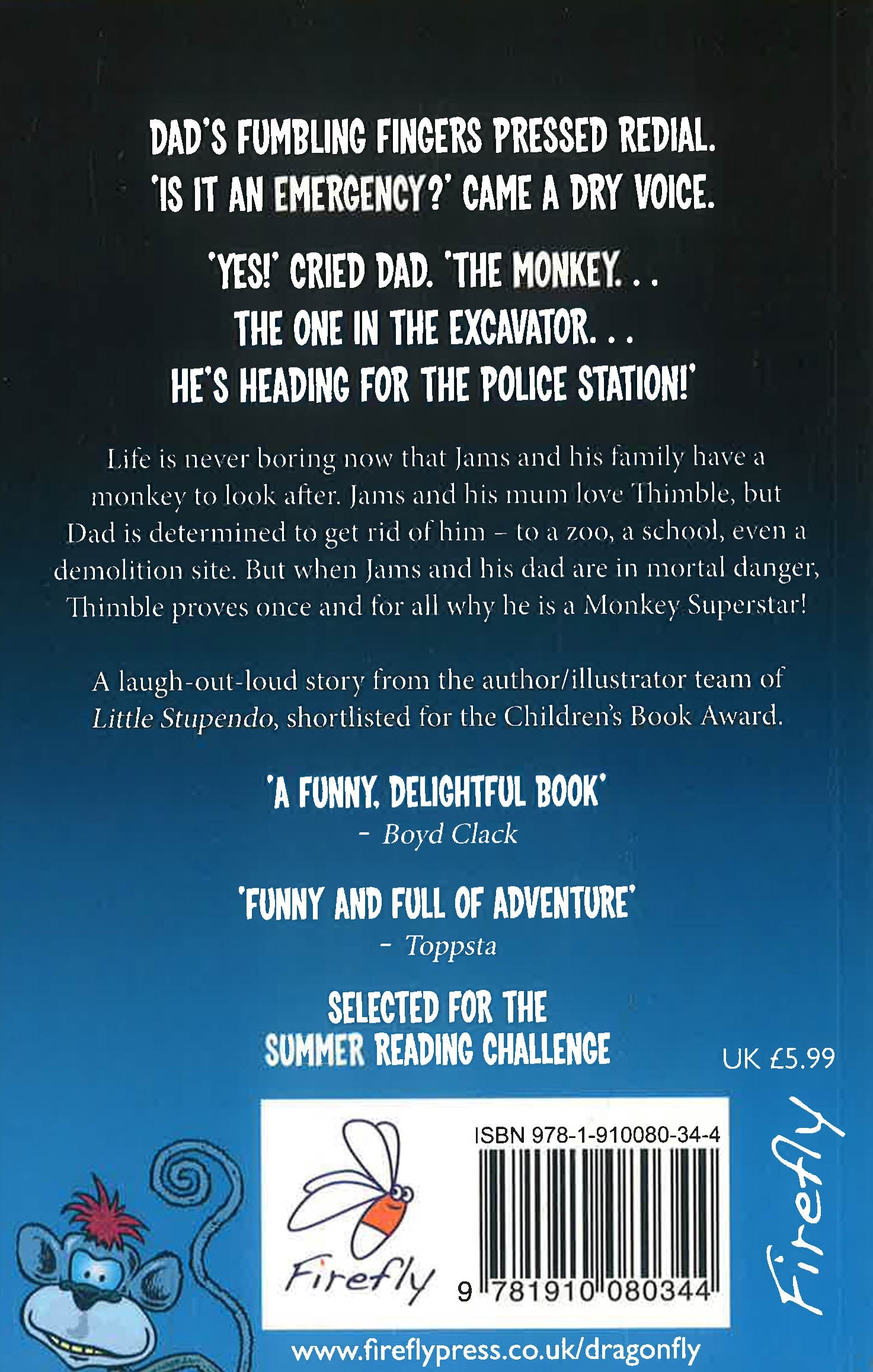 Life is never boring now that Jams and his family have a monkey to look after. Jams and his mum love Thimble, but Dad is determined to get rid of him - to a zoo, a school, even a demolition site. But when Jams and his dad are in mortal danger, Thimble proves once and for all why he is a Monkey Superstar! Thimble is very clever and very naughty - and just the best friend Jams has been waiting for. Illustrated by Martin Chatterton