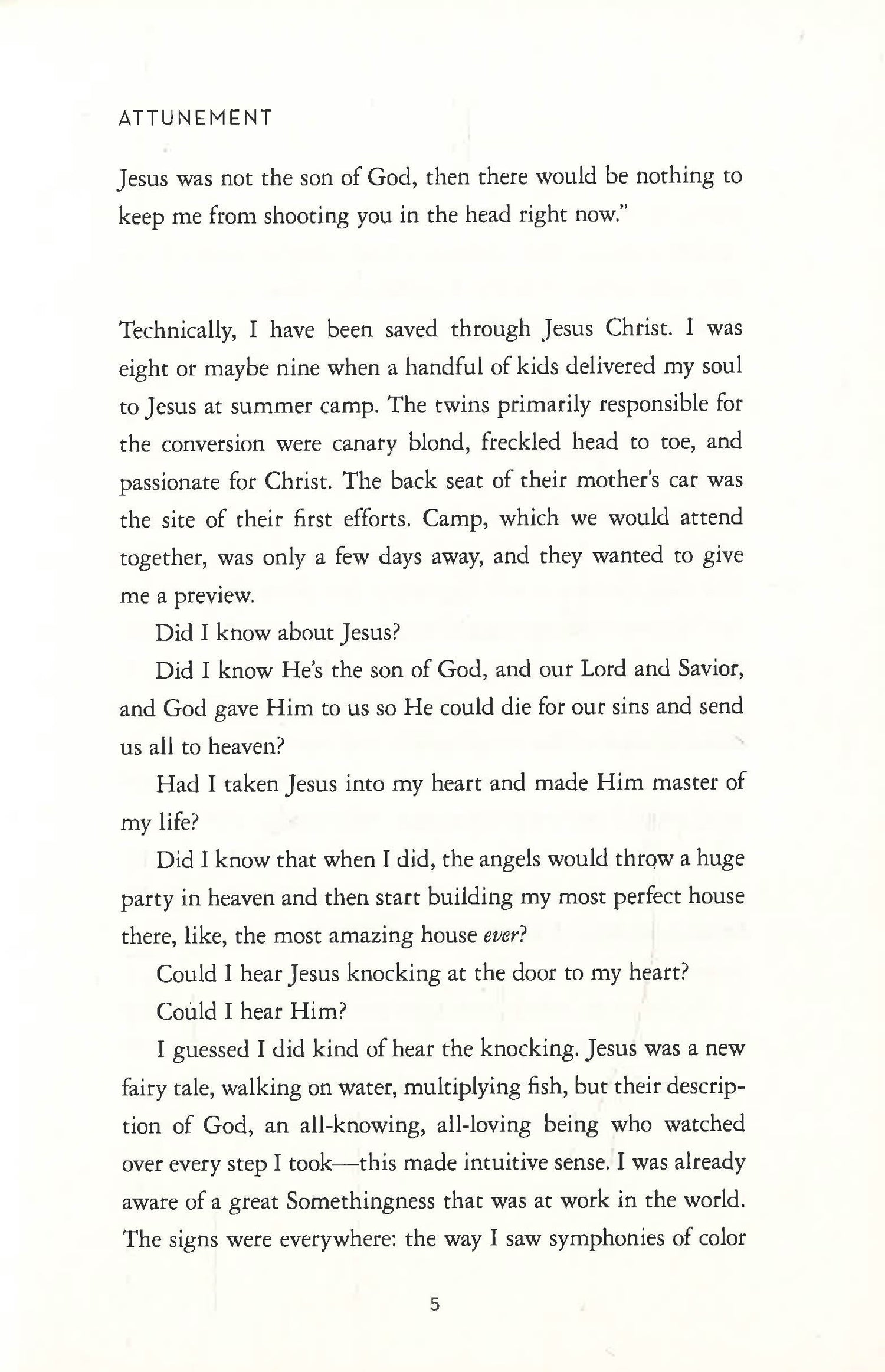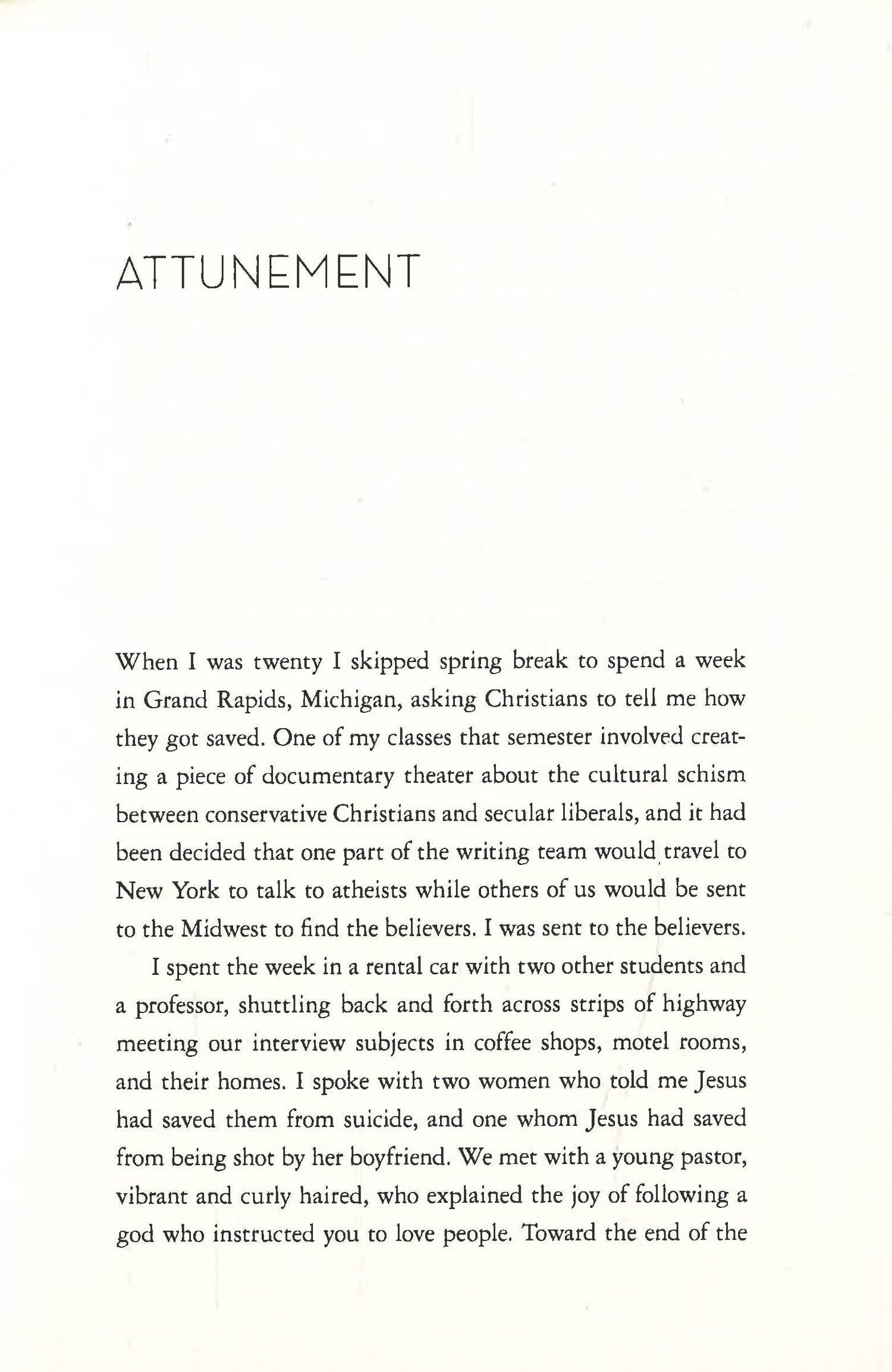 When Jordan Kisner was a child, she was saved by Jesus Christ at summer camp, much to the confusion of her nonreligious family. She was, she writes, "just naturally reverent," a fact that didn't change when she--much to her own confusion--lost her faith as a teenager. Not sure why her religious conviction had come or where it had gone, she did what anyone would do: "You go about the great American work of assigning yourself to other gods: yoga, talk radio, neoatheism, CrossFit, cleanses, football, the academy, the American Dream, Beyoncé."