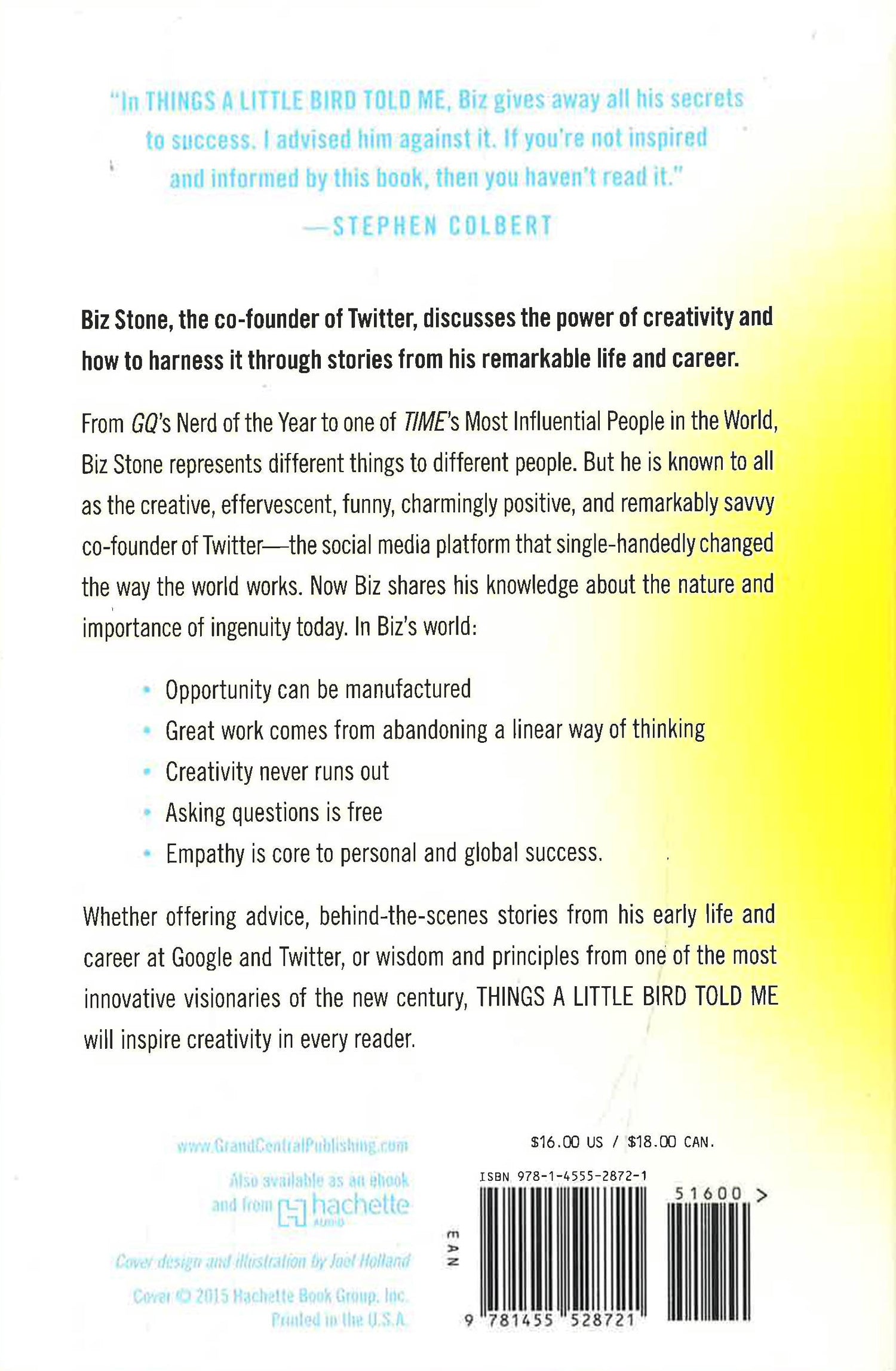 Biz Stone, the co-founder of Twitter, discusses the power of creativity and how to harness it, through stories from his remarkable life and career. THINGS A LITTLE BIRD TOLD ME From GQ's "Nerd of the Year" to one of Time's most influential people in the world, Biz Stone represents different things to different people. But he is known to all as the creative, effervescent, funny, charmingly positive and remarkably savvy co-founder of Twitter-the social media platform that singlehandedly changed the way the world works. Now, Biz tells fascinating, pivotal, and personal stories from his early life and his careers at Google and Twitter, sharing his knowledge about the nature and importance of ingenuity today. In Biz's world: -Opportunity can be manufactured -Great work comes from abandoning a linear way of thinking -Creativity never runs out -Asking questions is free -Empathy is core to personal and global success In this book, Biz also addresses failure, the value of vulnerability, ambition, and corporate culture. Whether seeking behind-the-scenes stories, advice, or wisdom and principles from one of the most successful businessmen of the new century, THINGS A LITTLE BIRD TOLD ME will satisfy every reader.