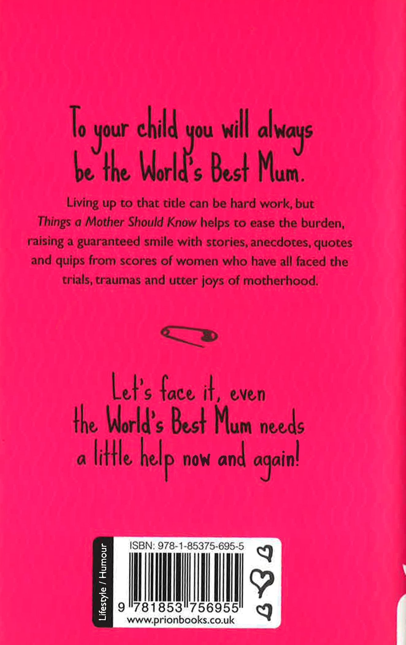 Every mother is special and every mother's relationship with her child is unique, but that doesn't mean that every mother acquires a magical gift when giving birth that allows her to glide effortlessly through the many trials of motherhood on a feather-pillow cloud of petal-pink kisses or powder blue hugs. To your child, you are the World's Best Mum, and living up to that title can be an enormous challenge, but it's a challenge made easier to tackle with a healthy dose of good humour and the benefit of the experiences of others.Despite the fact that your bond with your child is unique, you can rest assured that millions of women before you have gone through the same emotions, have faced the same dilemmas and have felt the same heartaches watching their children grow up. "Things A Mother Should Know" taps into the experiences of scores of women whose stories and anecdotes amuse and delight as they follow their children from infancy, through the growing pains of childhood into the troubled teenage years and then on into parenthood themselves.Guaranteed to raise a smile, browsing through "Things A Mother Should Know" is just what you need to help you face up to the lifelong job of being the World's Best Mum!