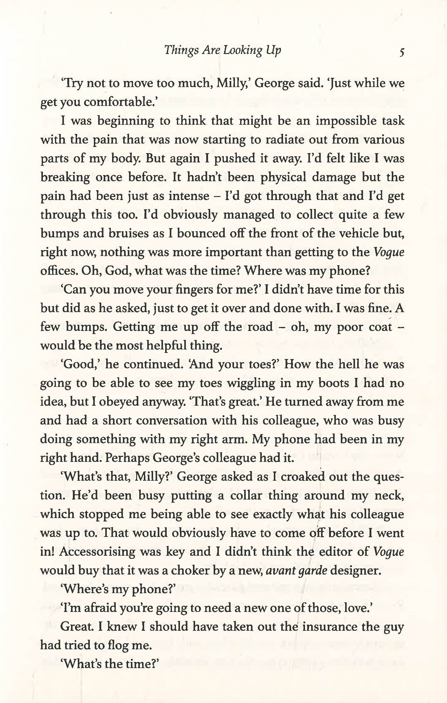 When Milly next opens her eyes, the consequences of her accident become clear. Everything she has worked for and dreamed of suddenly feels out of reach. But there is one bright spot on her horizon – the reappearance of her ex Jed, in all of his six-foot-four, broad-shouldered glory, with the most piercing ice blue eyes Milly ever saw.