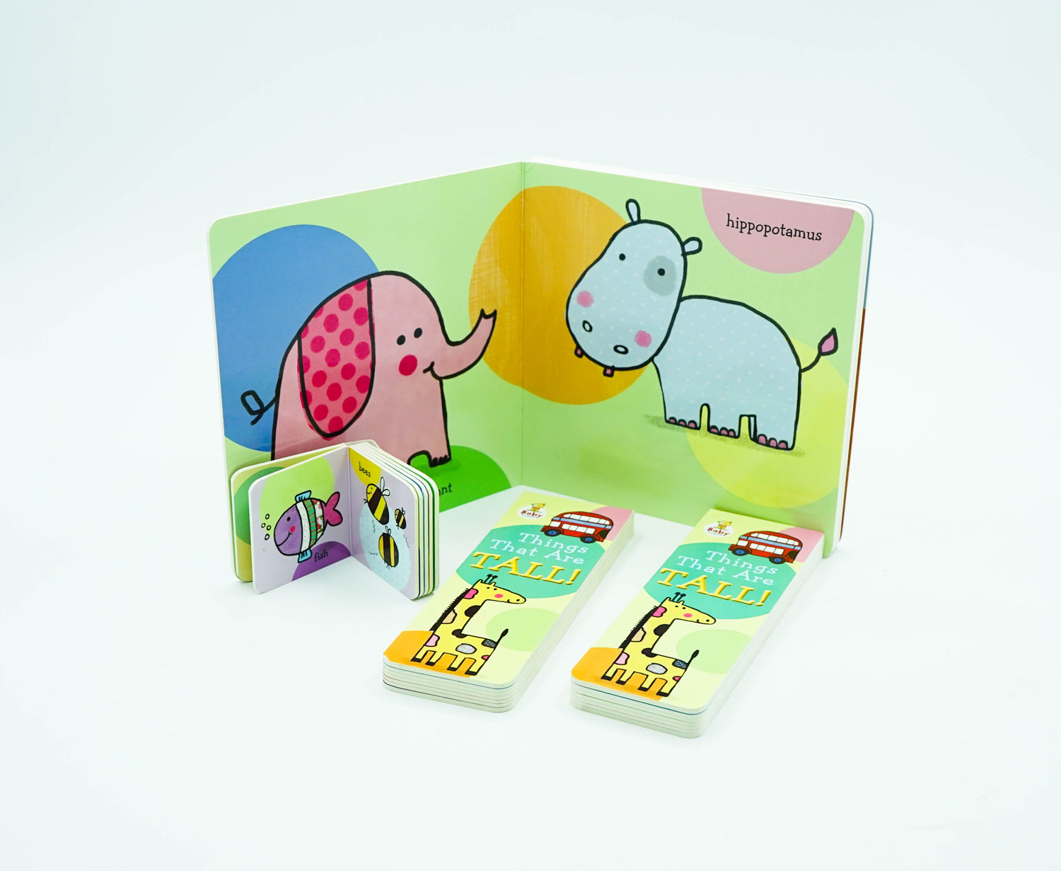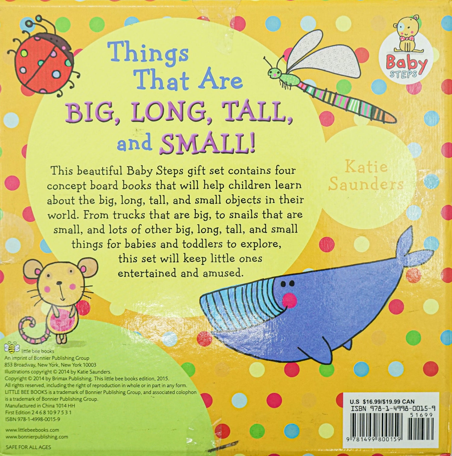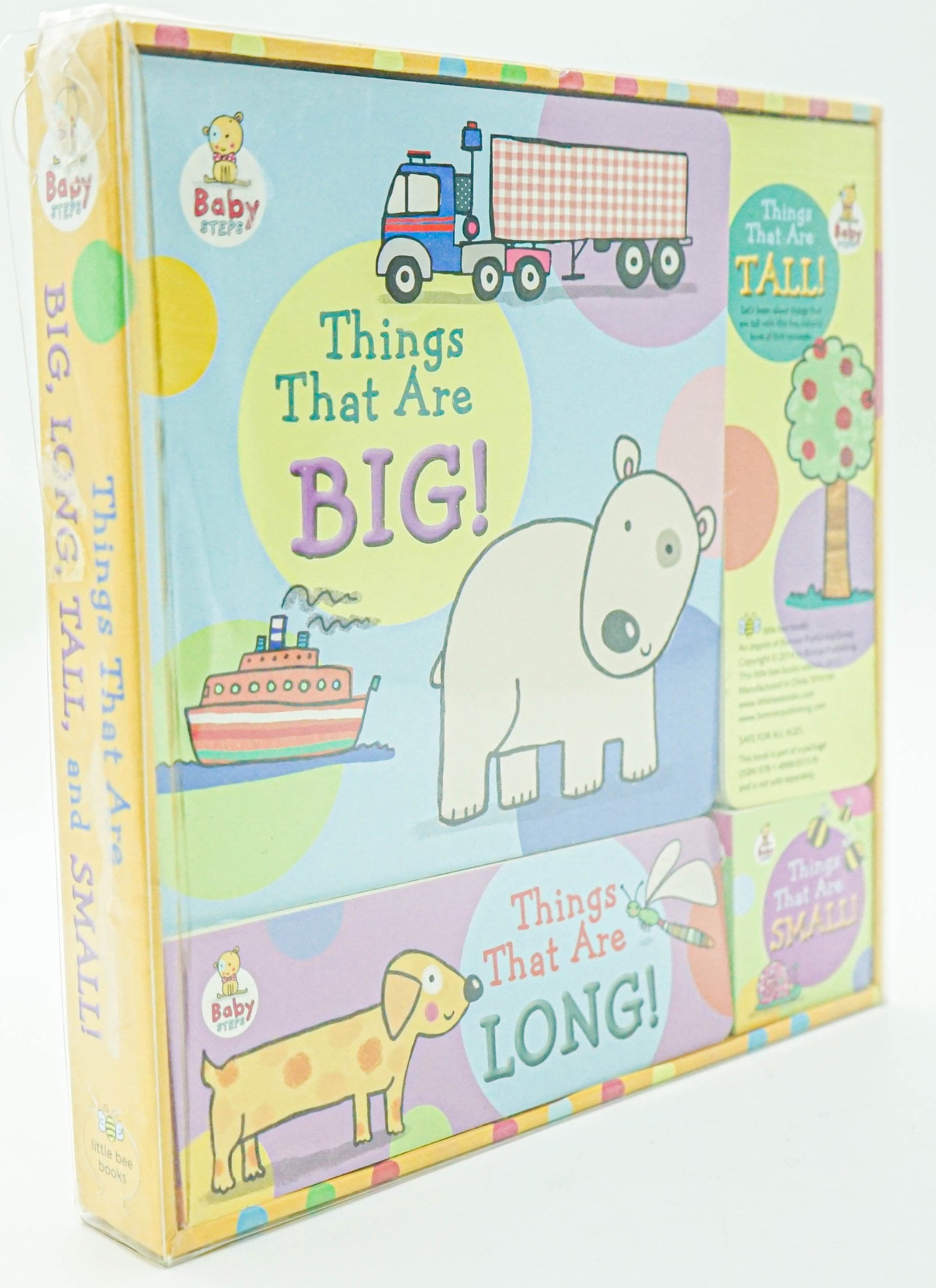 This Baby Steps gift set contains four concept board books of different shape and size: one book is big, one is long, one is tall, and the other is small! This beautiful Baby Steps gift set contains four concept board books of all different sizes. Children will love learning about the big, long, tall, and small objects in their world. From trucks that are big, to snails that are small, and lots of other big, long, tall, and small things for babies and toddlers to explore, this set will keep little ones entertained and amused. Featuring the bright and engaging artwork of Katie Saunders, this set makes the perfect gift for a new baby.