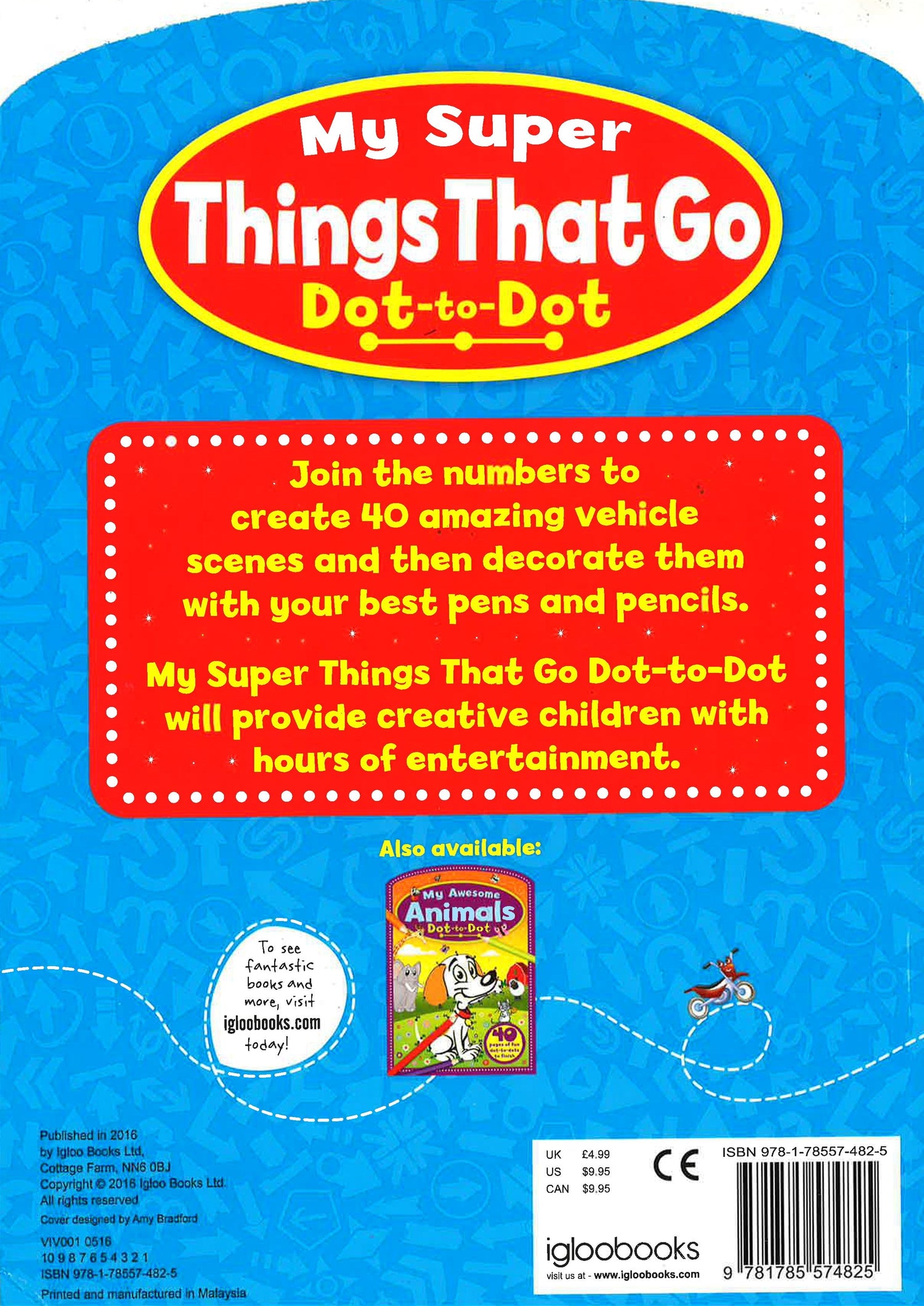 Join the numbers to create 40 amazing vehicle scenes and then decorate them with your best pens and pencils. My Super Things That Go Dot-to-Dot will provide creative children with hours of entertainment.