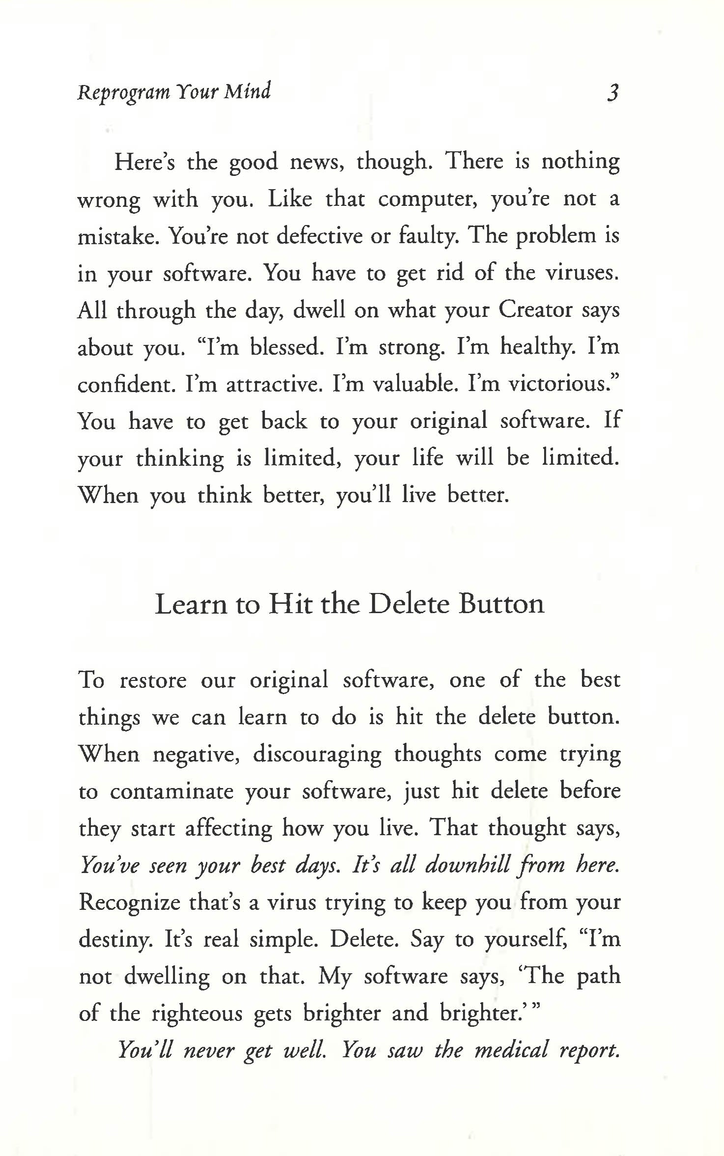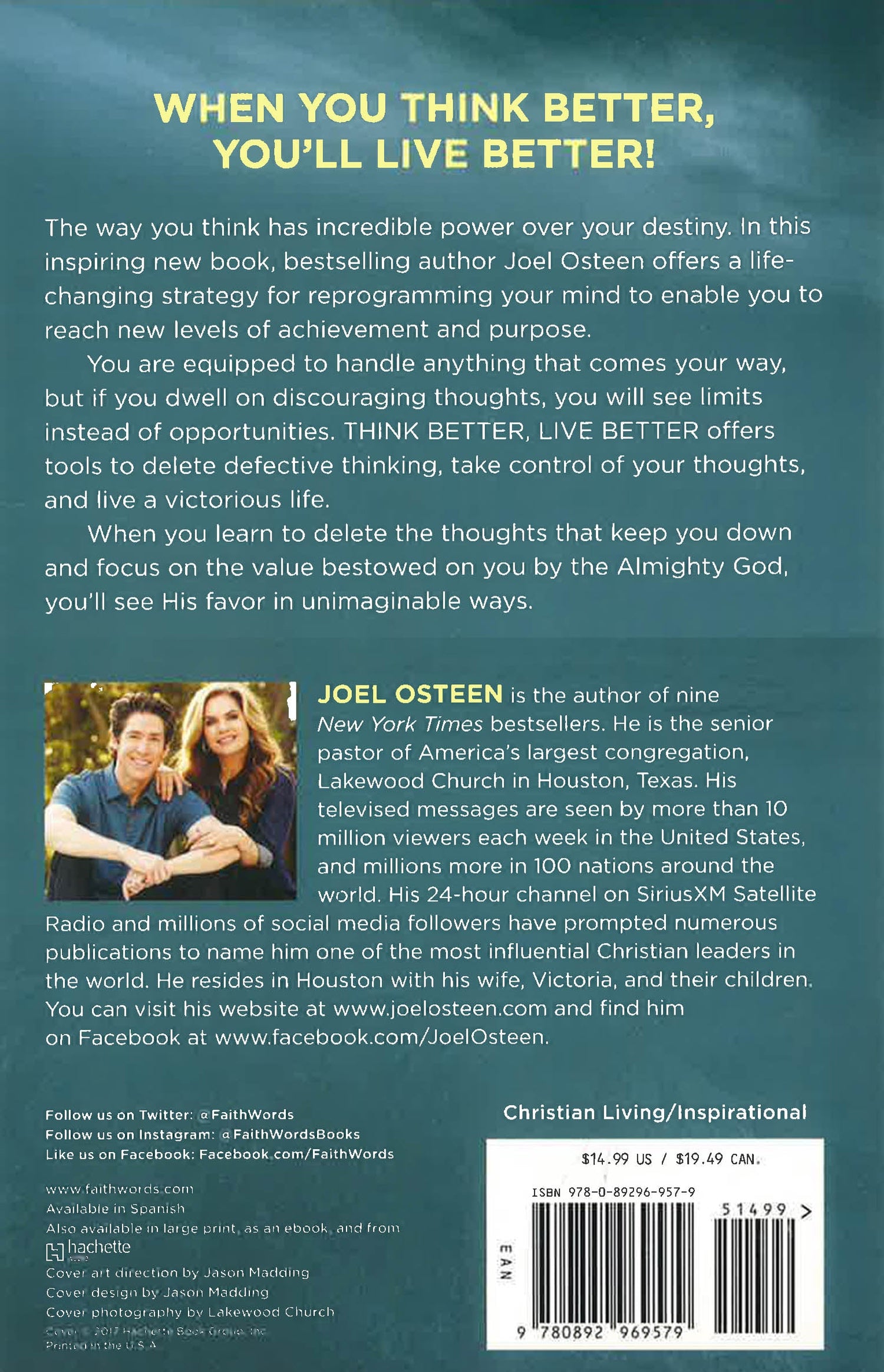 Your mind has incredible power over your success or failure. THINK BETTER, LIVE BETTER offers a simple yet life-changing strategy for erasing the thoughts that keep you down and reprogramming your mind with positive thinking to reach a new level of victory. As a child of the Most High God, you are equipped to handle anything that comes your way. To claim your destiny, start thinking about yourself the way God does and delete the thoughts that tear down your confidence. When you train yourself to tune out the negativity and tune into your calling, you'll begin to live the wonderful plans God has made for you.