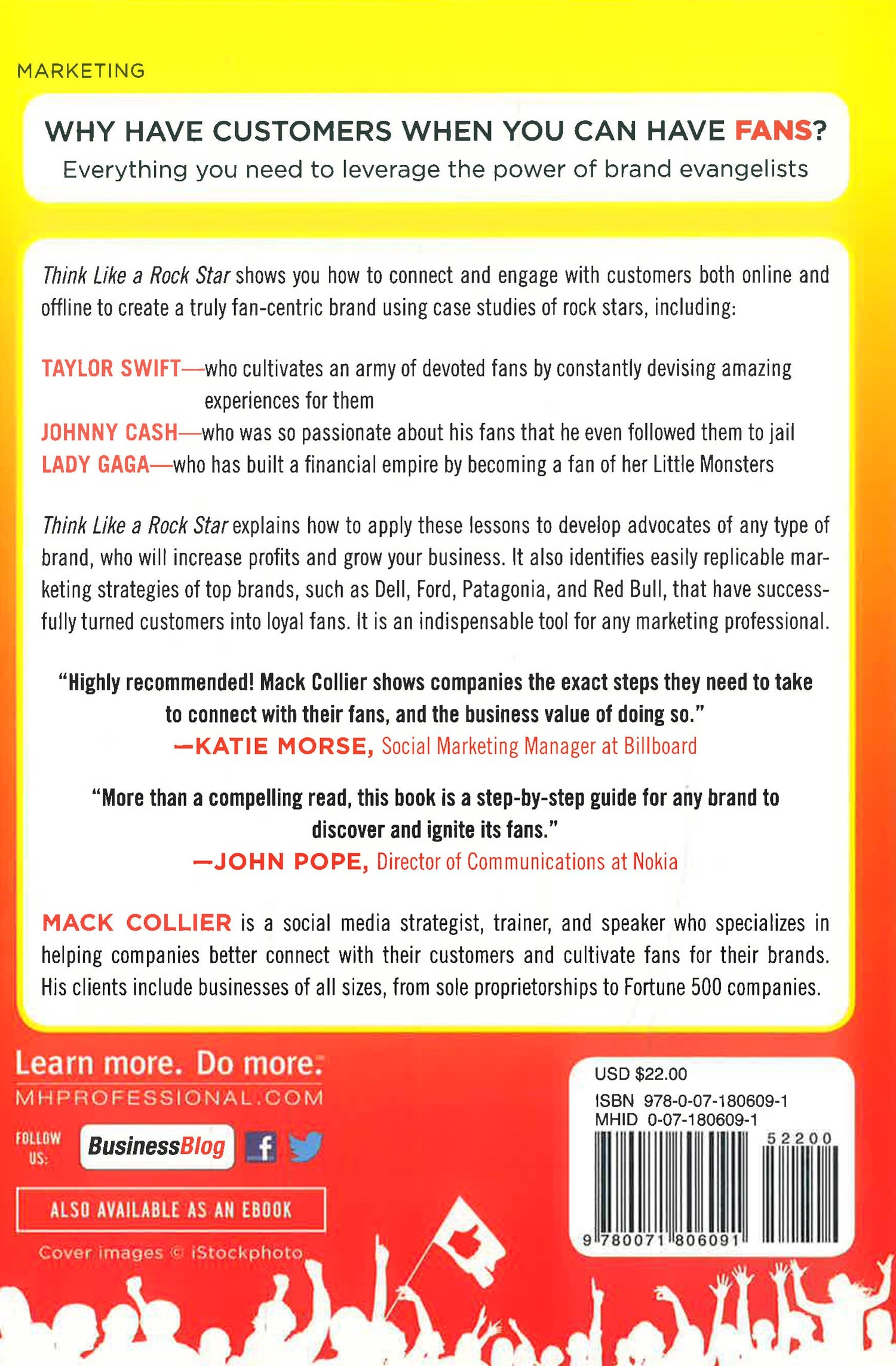 Think Like a Rock Star provides step-by-step instructions that show marketing professionals how to connect with customers both online and offline to create a truly fan-centric brand. Using case studies of how rock stars like Lady Gaga, Taylor Swift, Katy Perry, and Blink-182 cultivate fans, it teaches readers how to apply those lessons to create brand advocates who will grow profits, improve business frameworks, and contribute more than ever to the success of the brand. It also identifies successful and easily replicable marketing strategies of top brands such as Dell, Ford, Patagonia, and YouTube. Think Like a Rock Star is an indispensable tool for any marketing professional.