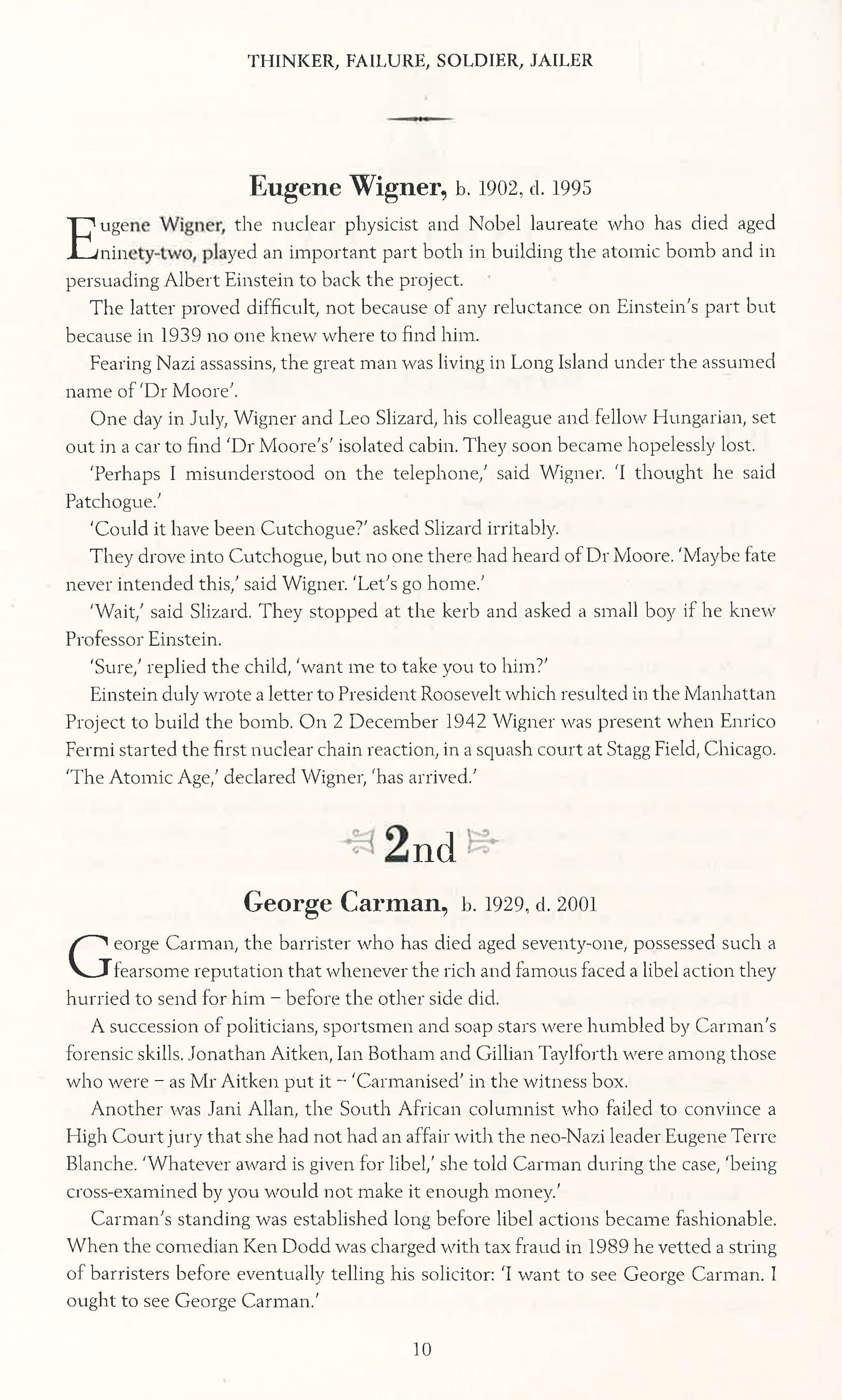 I did what I always do in times of trouble - consult not the Good Book, but a good book. This was Thinker, Failure, Soldier, Jailer, a collection of obituaries from the Daily Telegraph, the paper that first started printing warts and all descriptions of the dead.' Simon Hoggart, Guardian The Telegraph's obituaries pages are renowned for their quality of writing and capacity to distil the essence of a life from its most extraordinary moments. A unique mix of heroism, ingenuity, infamy and the bizarre, Thinker, Failure, Soldier, Jailer collects the very best of those obituaries to present an endlessly absorbing compendium of human endeavour. Organised day by day around the calendar year, with each life presented on the date it ended, the book features hundreds of remarkable stories. World statesmen jostle with glamorous celluloid stars, pioneering boffins sit alongside chart-topping rock 'n' rollers, while artists and their muses mingle with record-breaking sportsmen, Victoria Cross winners, spies, showgirls and captains of industry - as well as the titans of rather more esoteric fields. Here, for instance, can be found Britain's greatest goat breeder, a hangman who campaigned to abolish the death penalty, a priest to Soho's pimps, a cross-dressing mountaineer and a minister who preached a gospel of avarice - donations in notes only, please, as 'change makes me nervous'. A treasure trove of human virtue, vice and trivia, Thinker, Failure, Soldier, Jailer is the perfect gift for the armchair psychologist in all of us.