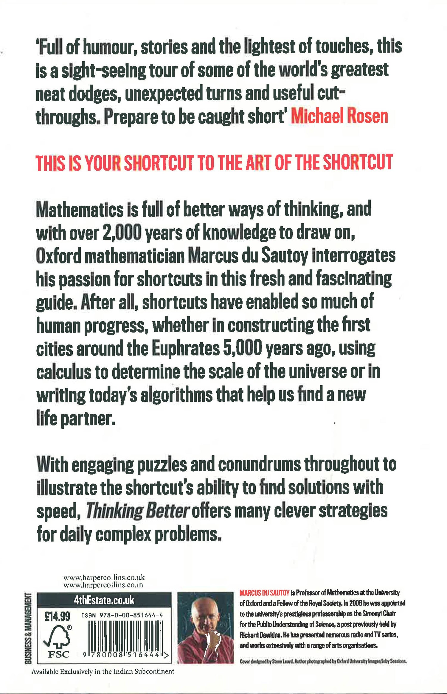 Mathematics is full of better ways of thinking, and with over 2,000 years of knowledge to draw on, Oxford mathematician Marcus du Sautoy interrogates his passion for shortcuts in this fresh and fascinating guide. After all, shortcuts have enabled so much of human progress, whether in constructing the first cities around the Euphrates 5,000 years ago, using calculus to determine the scale of the universe or in writing today’s algorithms that help us find a new life partner.