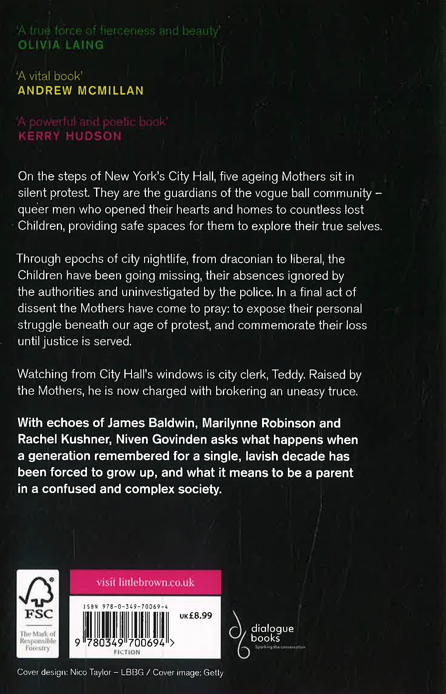 SHORTLISTED FOR THE GORDON BURN PRIZE 2019'A true force of fierceness and beauty' OLIVIA LAING 'A vital book' ANDREW MCMILLAN'This Brutal House leaves its reader full of a powerful, protesting energy' IRISH TIMES 'A powerful and poetic book' KERRY HUDSONOn the steps of New York's City Hall, five ageing Mothers sit in silent protest. They are the guardians of the vogue ball community - queer men who opened their hearts and homes to countless lost Children, providing safe spaces for them to explore their true selves.Through epochs of city nightlife, from draconian to liberal, the Children have been going missing; their absences ignored by the authorities and uninvestigated by the police. In a final act of dissent the Mothers have come to pray: to expose their personal struggle beneath our age of protest, and commemorate their loss until justice is served.Watching from City Hall's windows is city clerk, Teddy. Raised by the Mothers, he is now charged with brokering an uneasy truce.With echoes of James Baldwin, Marilynne Robinson and Rachel Kushner, Niven Govinden asks what happens when a generation remembered for a single, lavish decade has been forced to grow up, and what it means to be a parent in a confused and complex society.