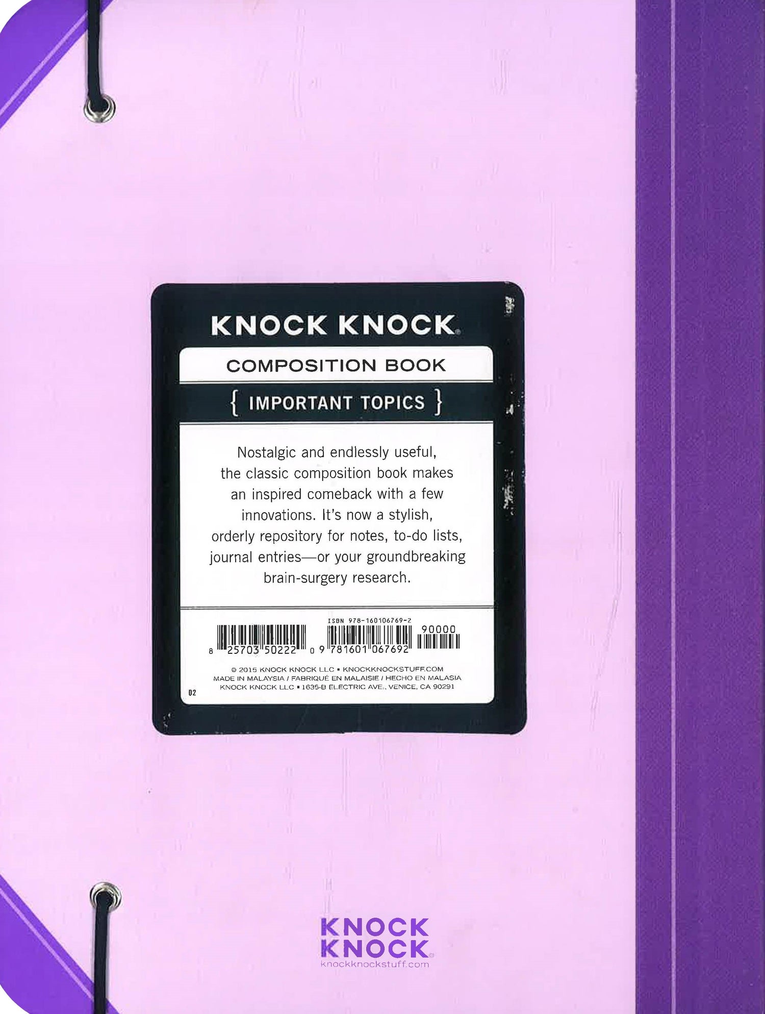 Nostalgic and endlessly useful, the classic composition book makes an inspired comeback with a few innovations. It's now a stylish, orderly repository for notes, to-do lists, journal entries--or your groundbreaking brain-surgery research.* Fun notebooks make blah lectures bearable* Plot your novel--or a plan of attack* Hardcover; 7.5 x 9.75 inches; 120 pages with corner perforations; elastic closure