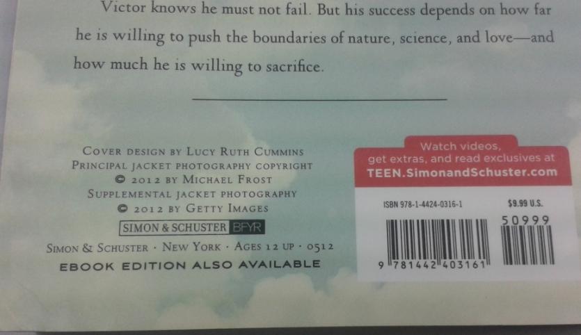 Frankenstein, sixteen-year-old Victor Frankenstein begins a dark journey that will change his life forever. Victor's twin, Konrad, has fallen ill, and no doctor is able to cure him. Unwilling to give up on his brother, Victor enlists his beautiful cousin Elizabeth and his best friend, Henry, on a treacherous search for the ingredients to create the forbidden Elixir of Life. Impossible odds, dangerous alchemy, and a bitter love triangle threaten their quest at every turn. Victor knows he must not fail. But his success depends on how far he is willing to push the boundaries of nature, science, and love - and how much he is willing to sacrifice.