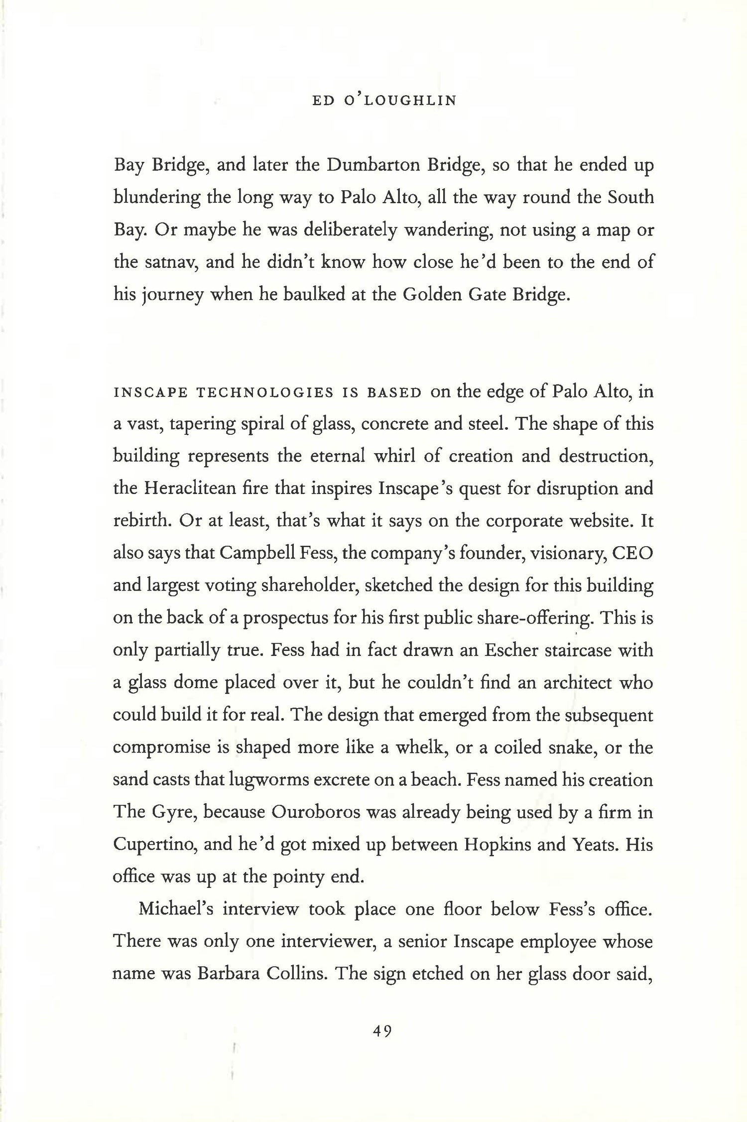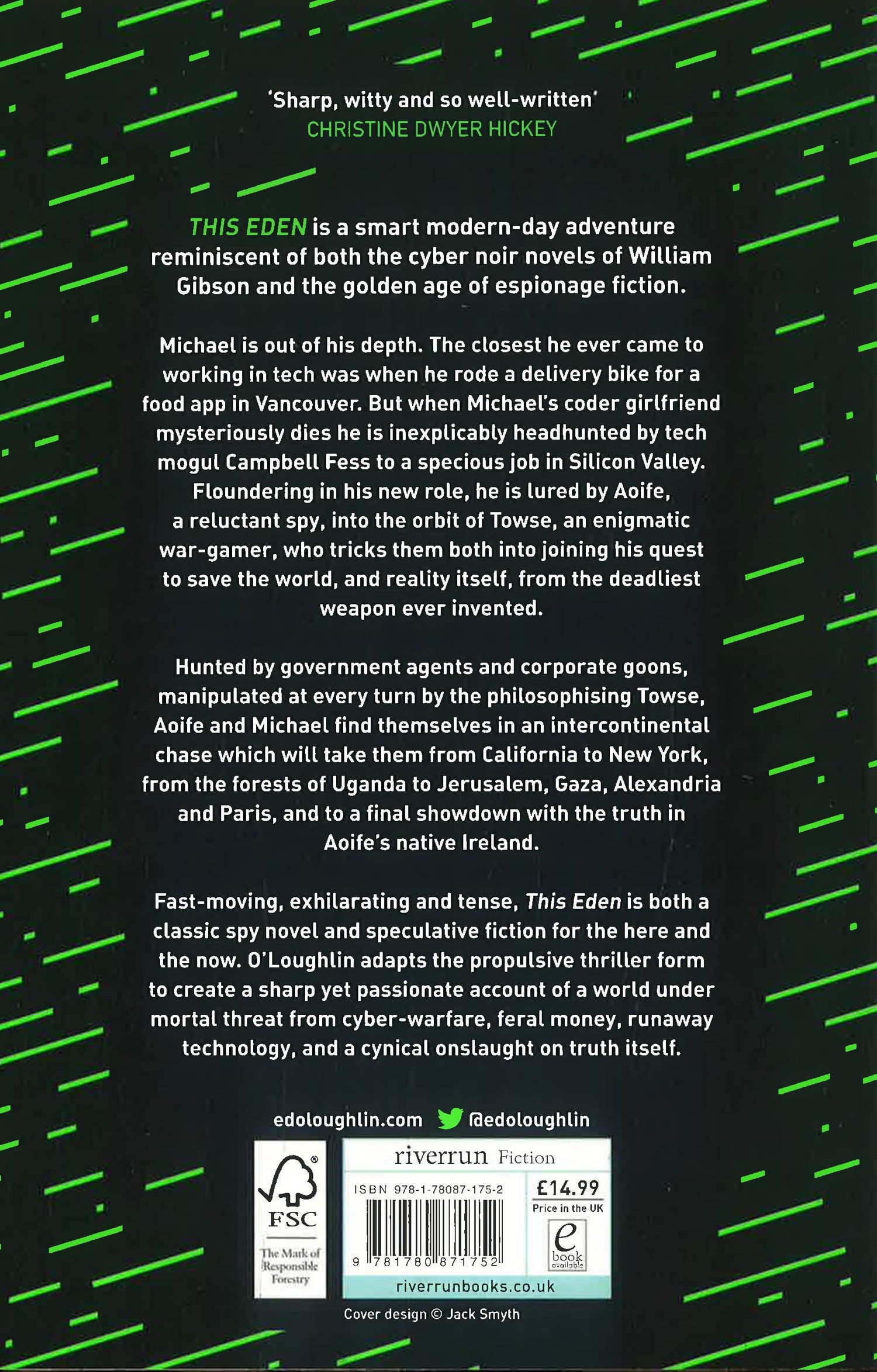 This Eden is a smart modern-day adventure reminiscent of both the cyber noir novels of William Gibson and the golden age of espionage fiction. Ever felt like you were living in a dystopian tech thriller? That's because you are... Michael is out of his depth. The closest he ever came to working in tech was when he rode a delivery bike for a food app in Vancouver. Yet when his coder girlfriend dies, he is inexplicably headhunted by sinister tech mogul Campbell Fess, who transplants him to Silicon Valley. There, a reluctant female spy named Aoife lures him into the hands of Towse, an enigmatic war-gamer, who tricks them both into joining his quest to save the world, and reality itself, from the deadliest weapon ever invented. Hunted by government agents and corporate goons, manipulated at every turn by the philosophising Towse, Aoife and Michael find themselves in an intercontinental chase which will take them from California to New York, from the forests of Uganda to Jerusalem, Gaza, Alexandria and Paris, and to a final showdown with the truth in Aoife's native Ireland. Fast-moving, exhilarating and tense, This Eden is both a classic spy novel and speculative fiction for the here and the now. O'Loughlin adapts the propulsive thriller form to create a sharp yet passionate account of a world under mortal threat from cyber-warfare, feral money, runaway technology, and a cynical onslaught on truth itself.