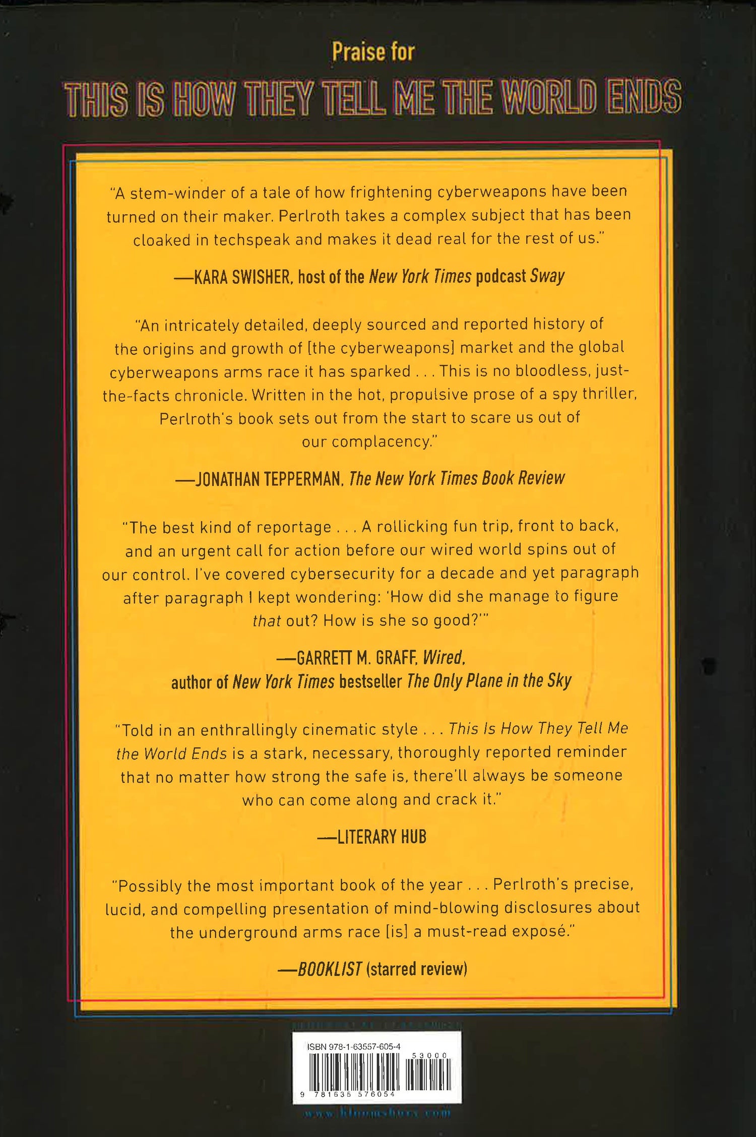 Filled with spies, hackers, arms dealers, and a few unsung heroes, written like a thriller and a reference, This Is How They Tell Me the World Ends is an astonishing feat of journalism. Based on years of reporting and hundreds of interviews, The New York Times reporter Nicole Perlroth lifts the curtain on a market in shadow, revealing the urgent threat faced by us all if we cannot bring the global cyber arms race to heel.