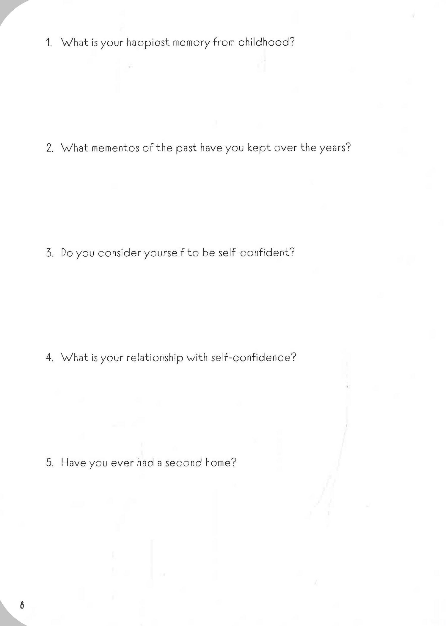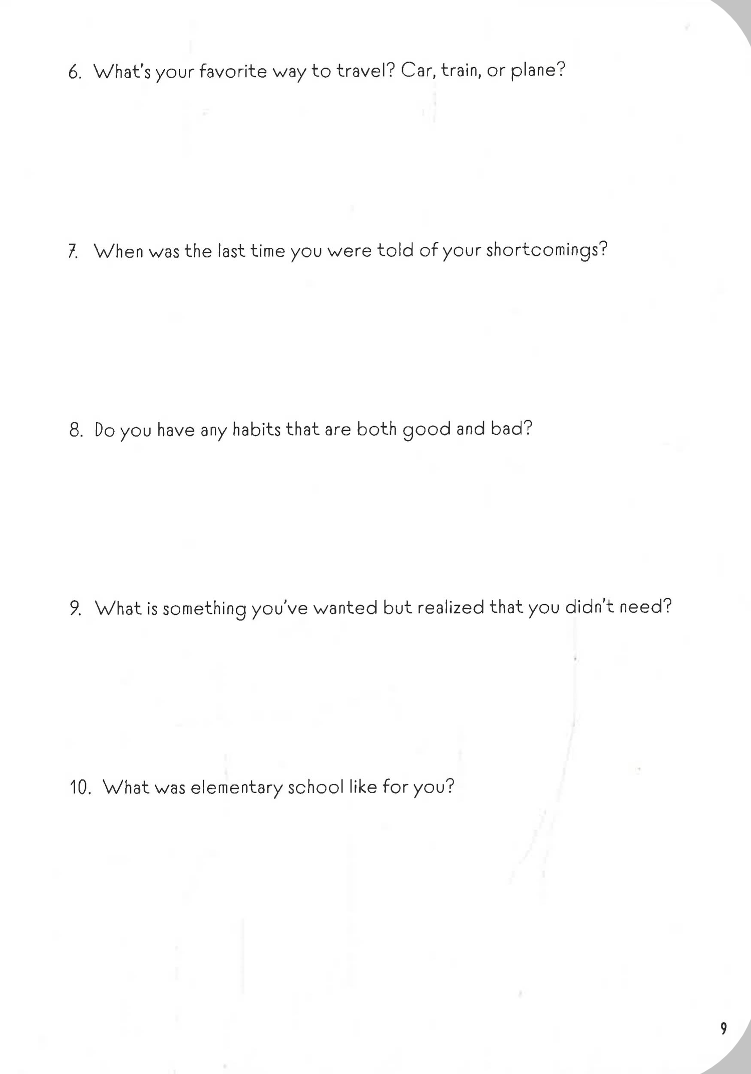 Broken up into 4 sections–About Me, A Little History, The Present is a Present, and Looking forward to the Future–these thoughtful questions flesh out every aspect of a person. Both reflective and entertaining, these questions offer a chance to delve into the depths of your soul or joke around with yourself in an insightful way. Use these answers to discover more about yourself, write an autobiography, or just pass the time with something other than doom scrolling.