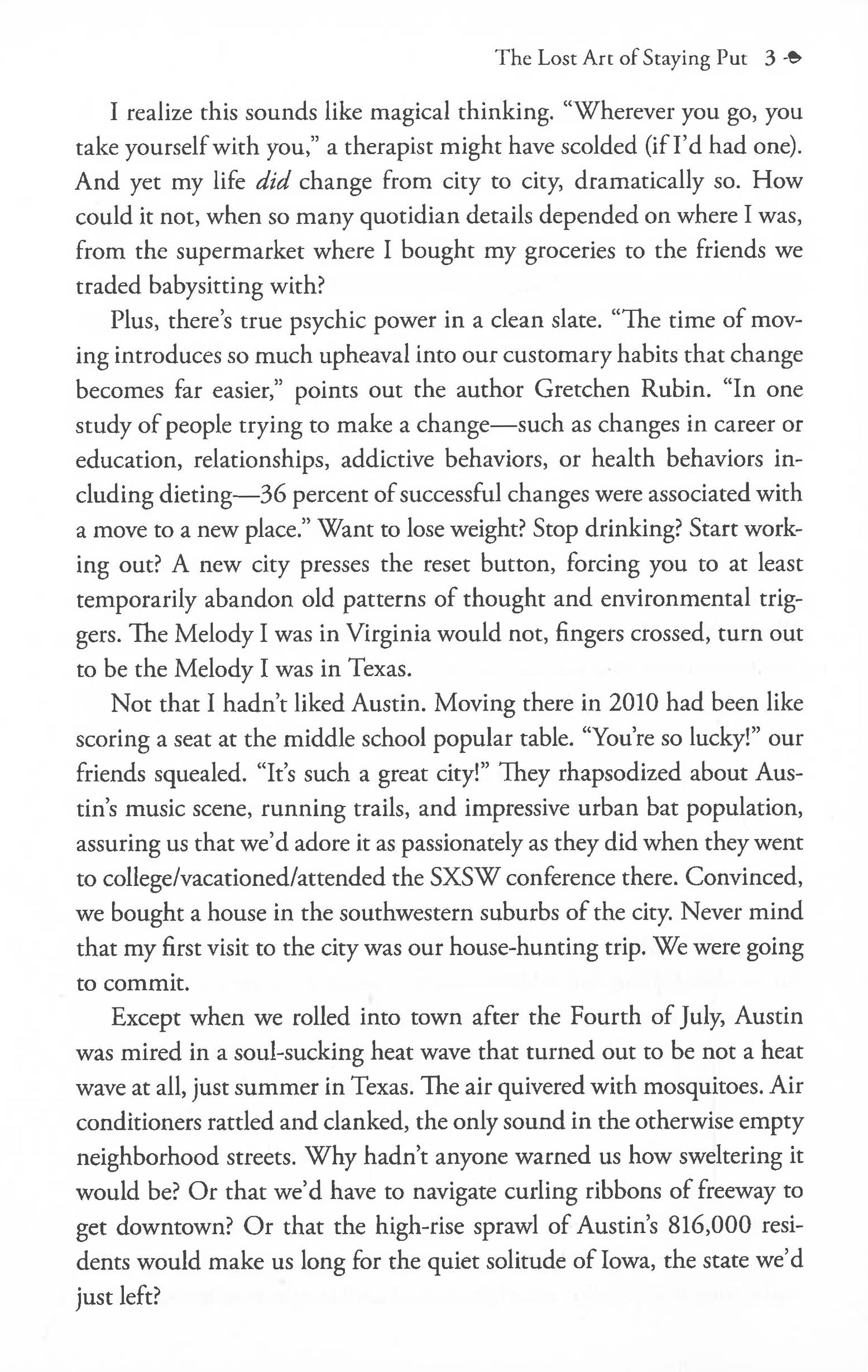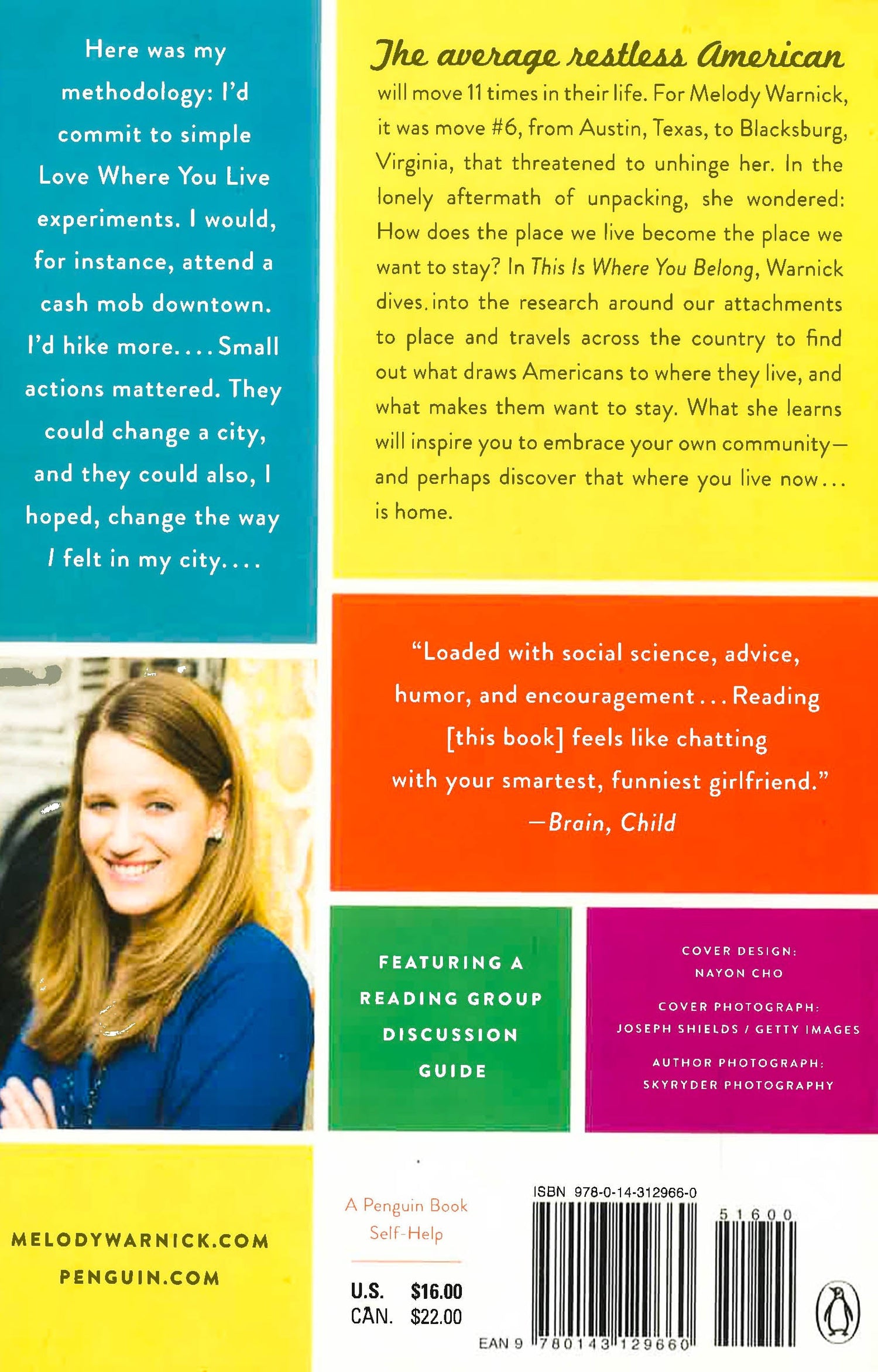 In the spirit of Gretchen Rubin's megaseller The Happiness Project and Eric Weiner's The Geography of Bliss, a journalist embarks on a project to discover what it takes to love where you live The average restless American will move 11.7 times in a lifetime. For Melody Warnick, it was move #6, from Austin, Texas, to Blacksburg, Virginia, that threatened to unhinge her. In the lonely aftermath of unpacking, she wondered: Aren't we supposed to put down roots at some point? How does the place we live become the place we want to stay? This time, she had an epiphany. Rather than hold her breath and hope this new town would be her family's perfect fit, she would figure out how to fall in love with it--no matter what.