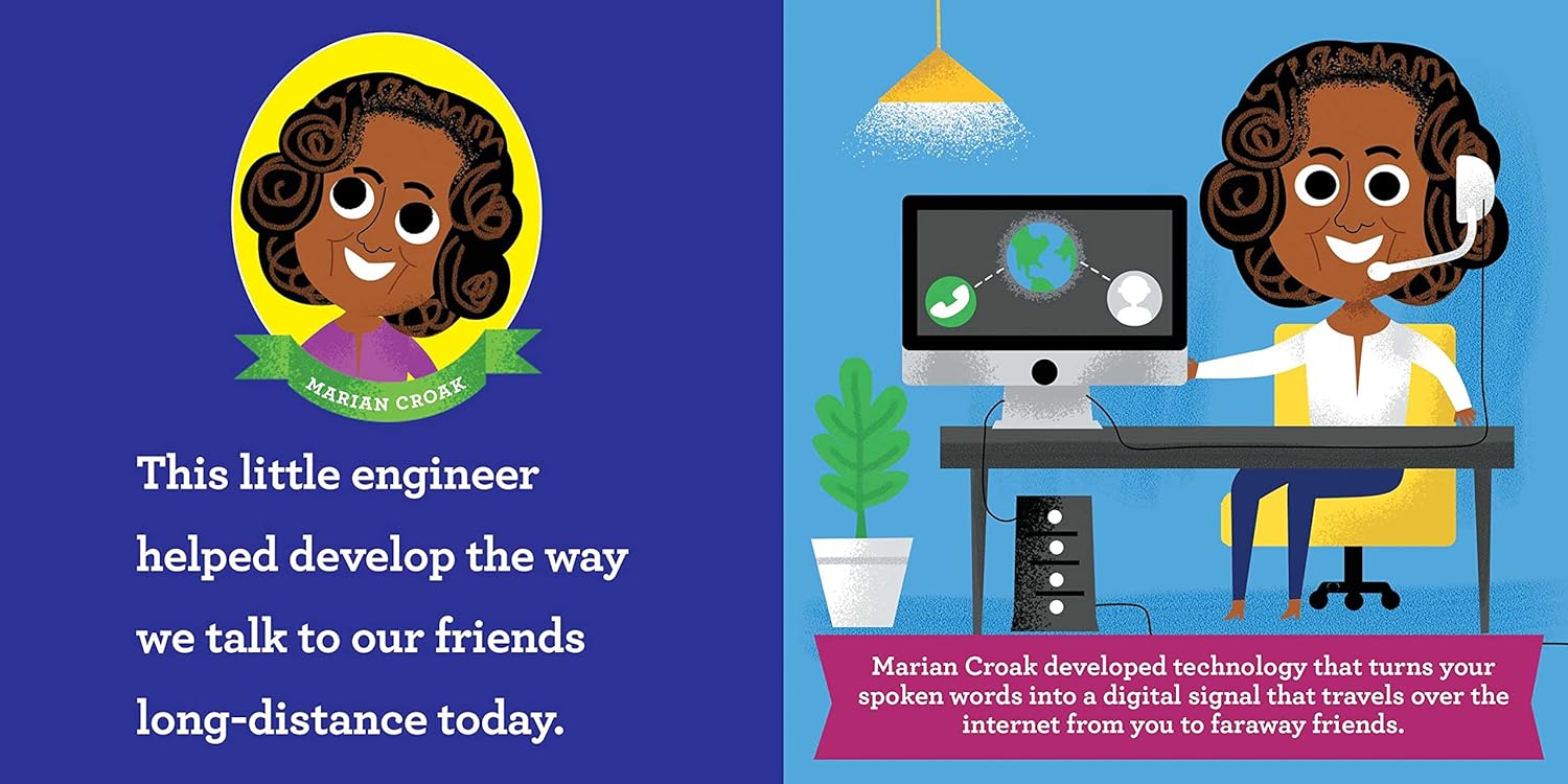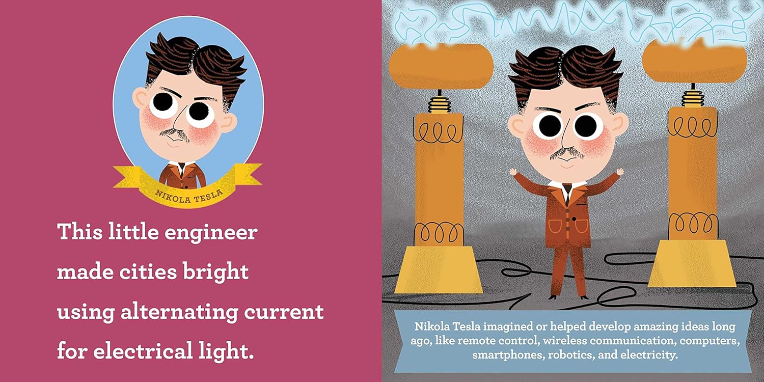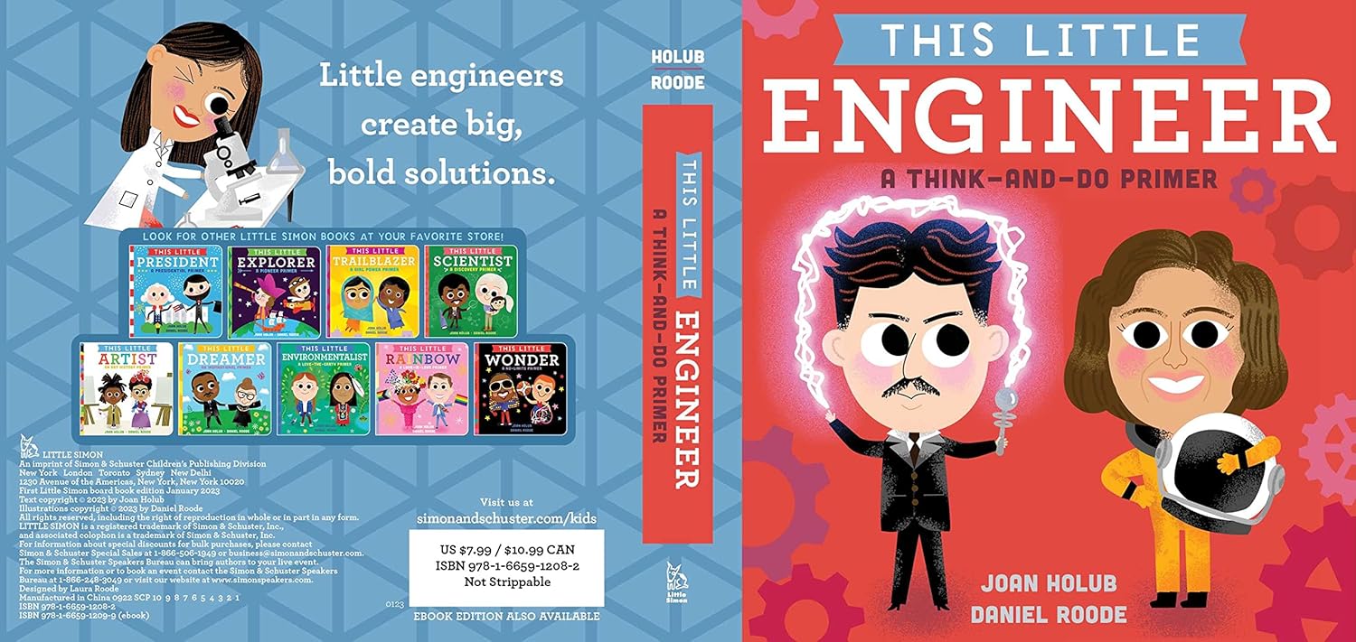 This Little Engineer, A Think and Do Primer. Now even the youngest readers can learn all about the amazing, inspiring work engineers do every day! Highlighting ten memorable people who paved the way, parents and little ones alike will love this discovery primer full of fun, age-appropriate facts and bold illustrations. Latina astronaut Ellen Ochoa, Indian American nanotechnologist Sangeeta Bhatia, Chinese American artificial intelligence engineer Fei-Fei Li, Apple whiz Steve Wozniak, electricity genius Nikola Tesla, Gustave Eiffel of Eiffel tower and Statue of Liberty skeleton fame, and more! ((The final spread features 11 bonus engineers for even more inspiration!)