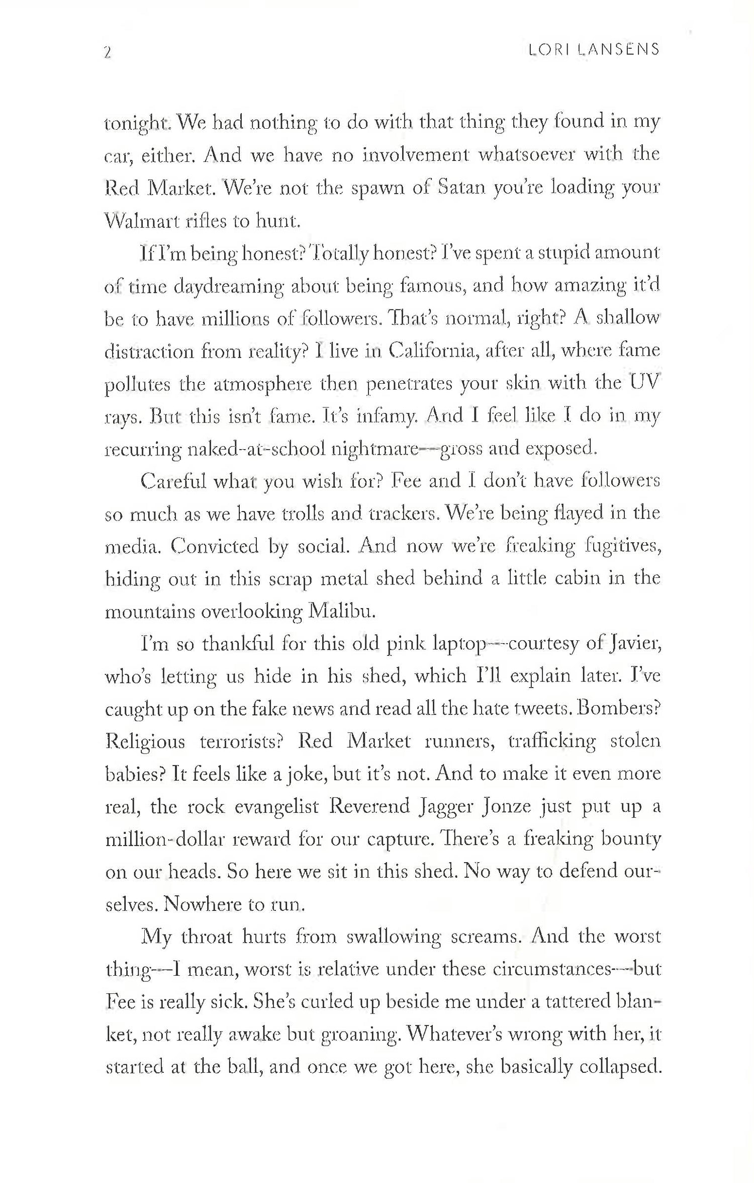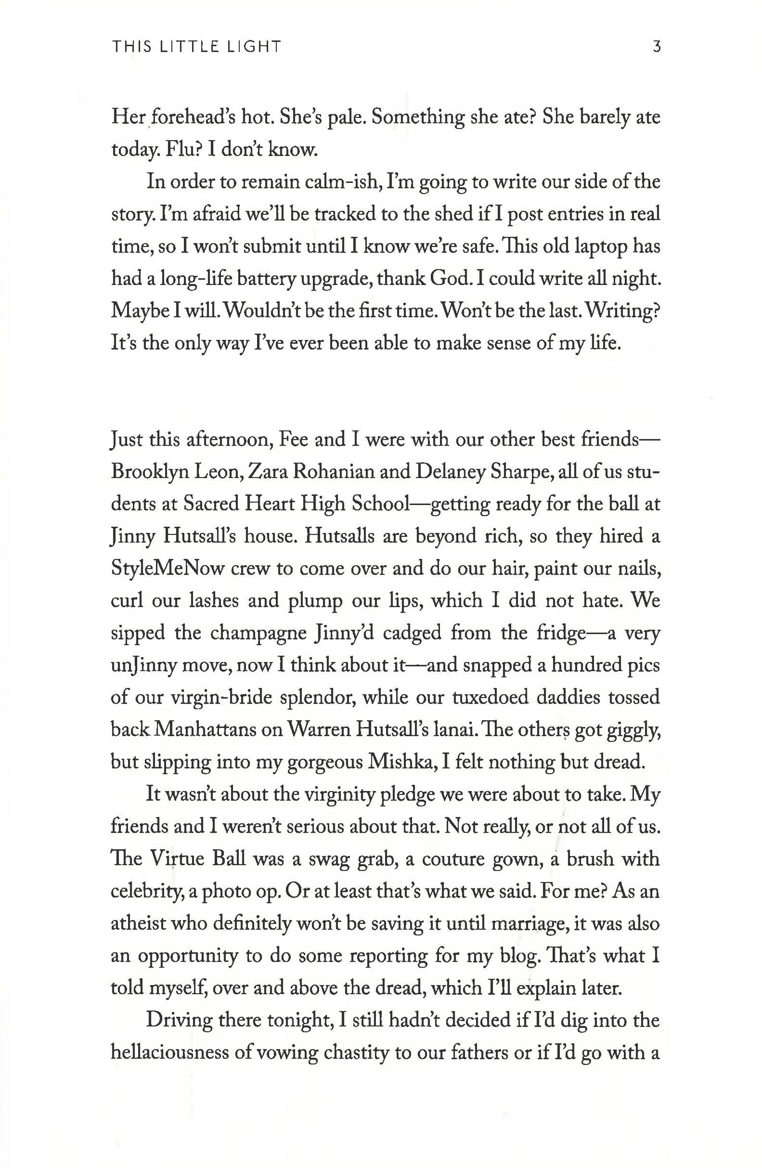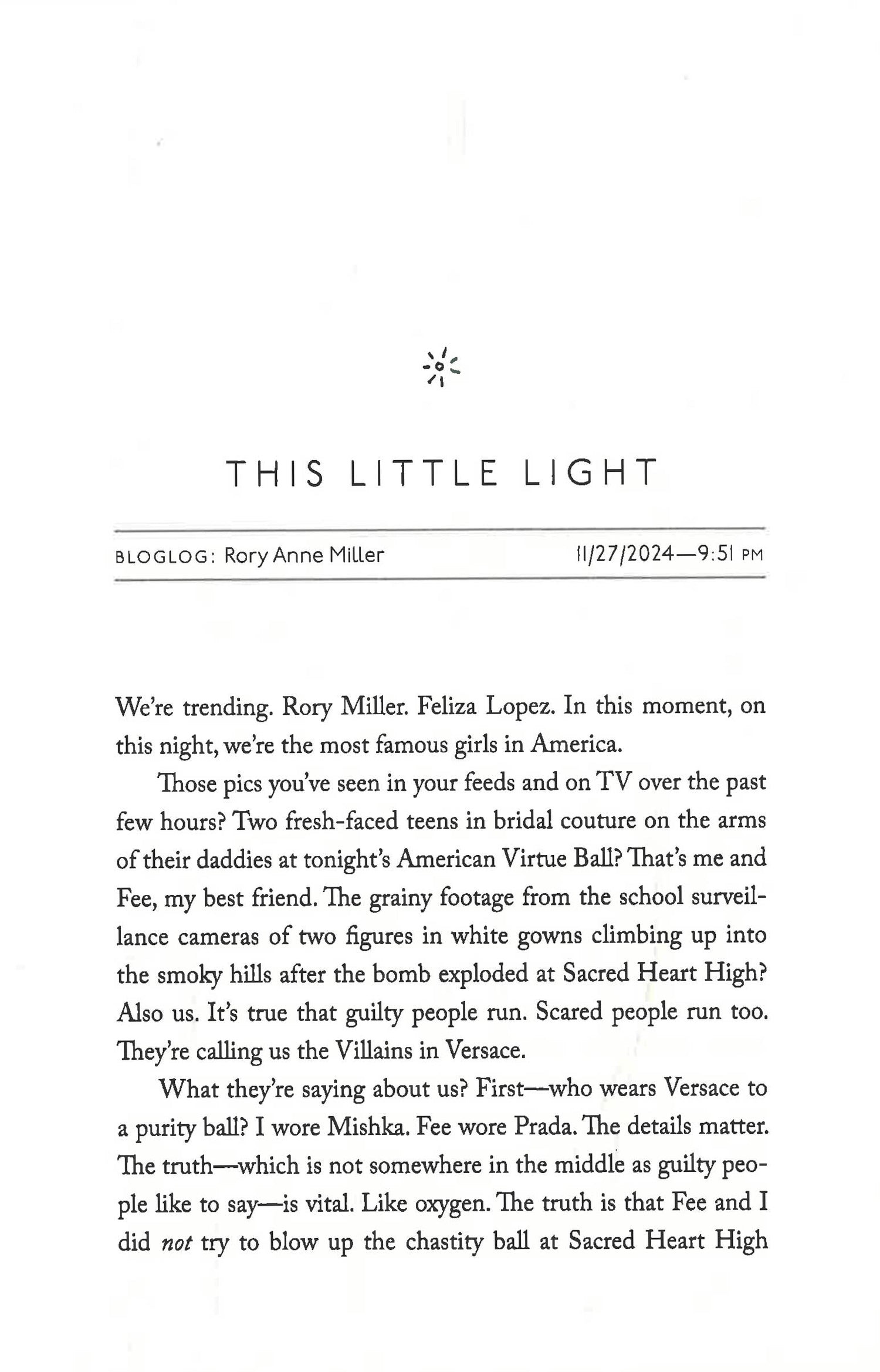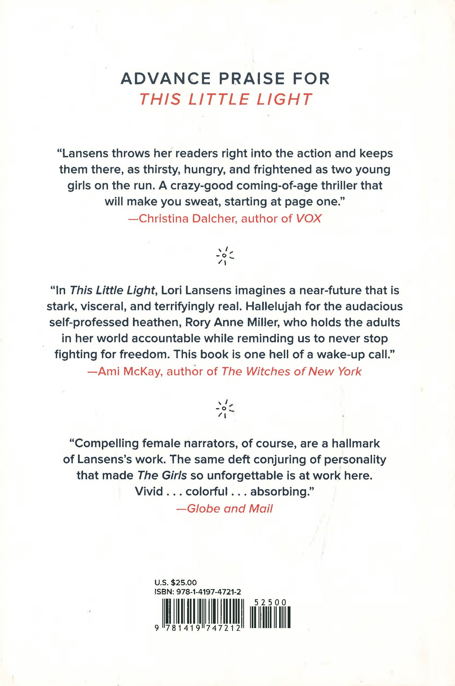 Taking place over the course of forty-eight pulse-pounding hours, This Little Light draws readers into a near-future world of born-again Christians and celebrity worship where abortion is illegal and surveillance is everywhere. Sixteen-year-old Rory Miller and her best friend, Fee, are on the run after a bomb explodes at their elite Christian private school inside their triple-gated California community.