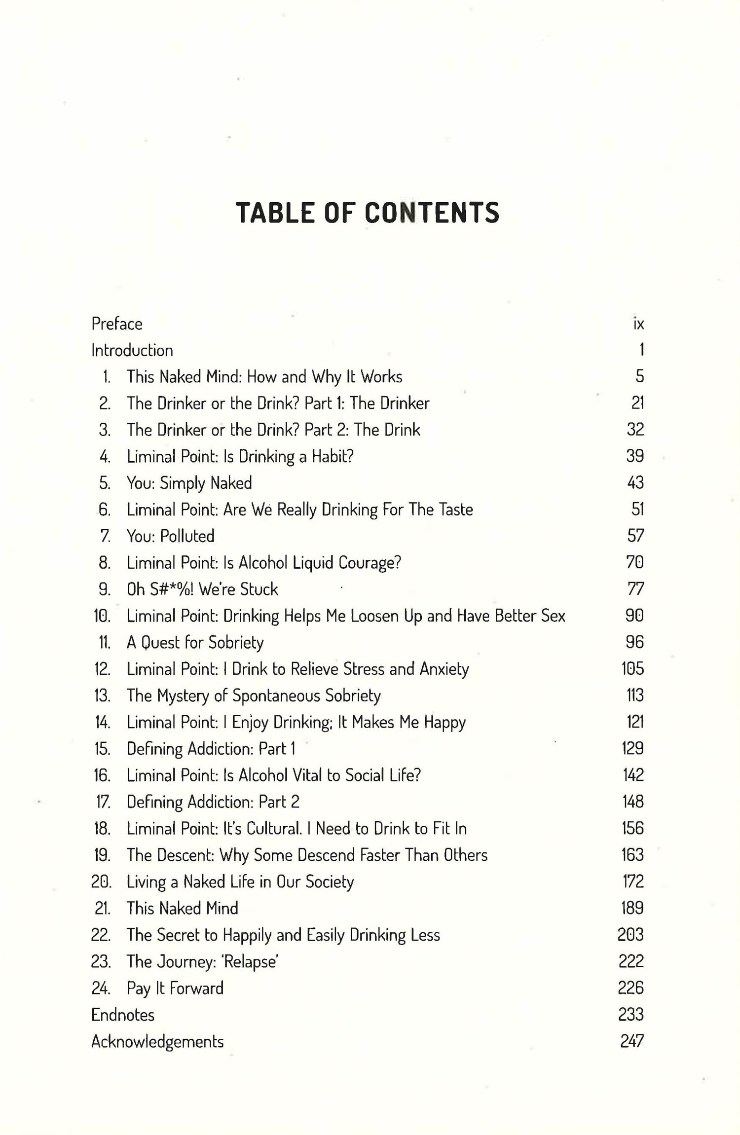 This Naked Mind offers a new solution. Packed with surprising insight into the reasons we drink, it will open your eyes to the startling role of alcohol in our culture. Annie Grace brilliantly weaves psychological, neurological, cultural, social and industry factors with her extraordinarily candid journey resulting in a must read for anyone who drinks.