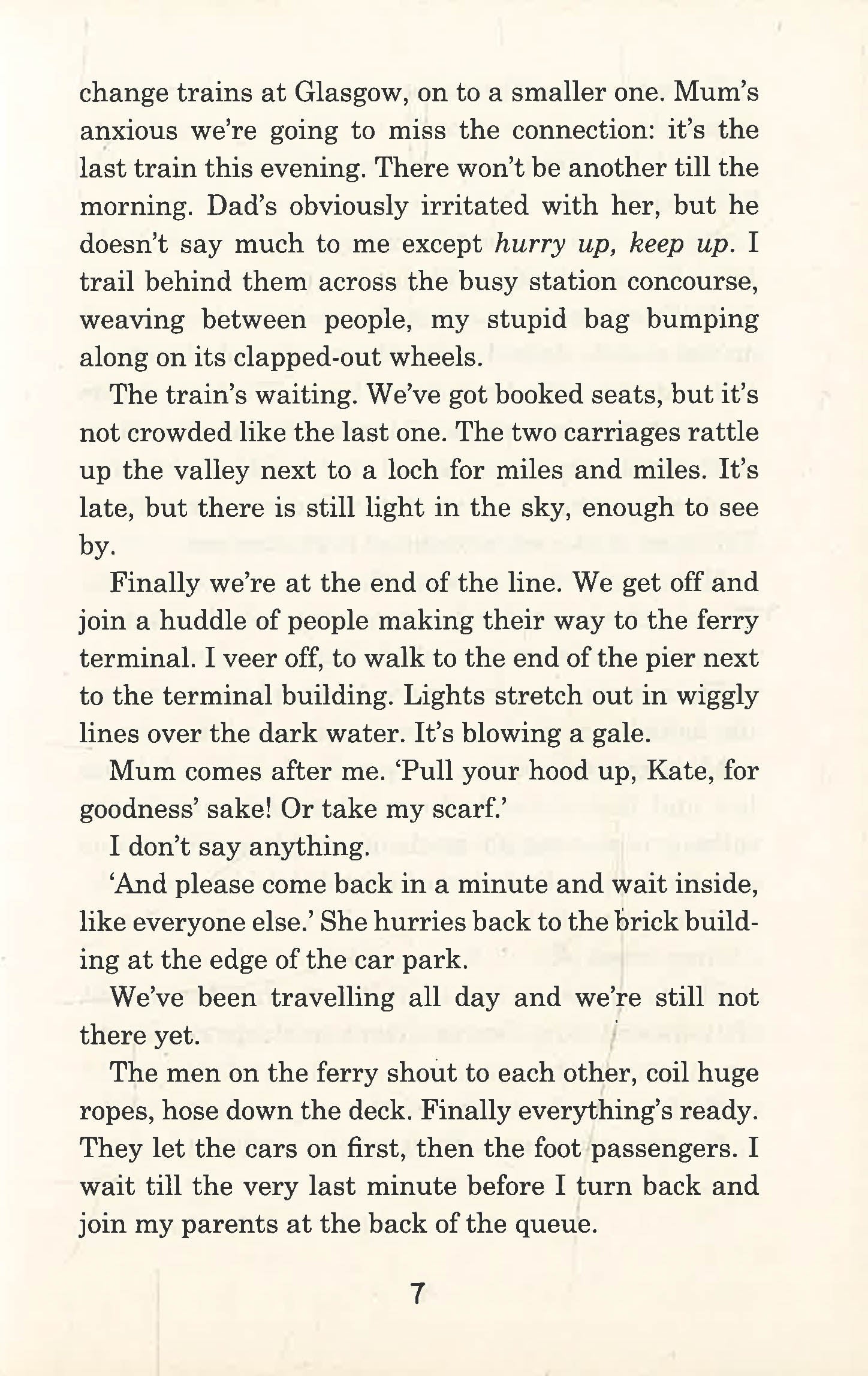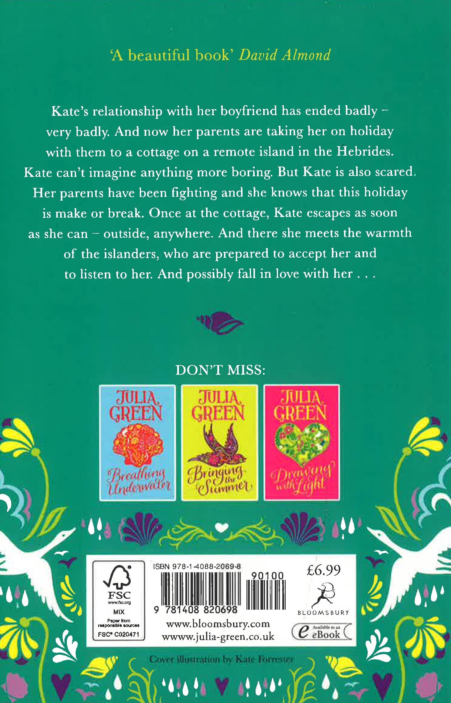 Kate's parents are taking her on holiday with them to a cottage on a remote island in the Hebrides. Kate can't imagine anything more boring. But underneath her sulkiness, Kate is scared. Her parents have been fighting and she knows that for her parents this holiday is make or break. Once at the cottage, Kate escapes - outside, anywhere. And there she meets the warmth of the islanders, who are prepared to accept her and to listen to her. And possibly fall in love with her . . .