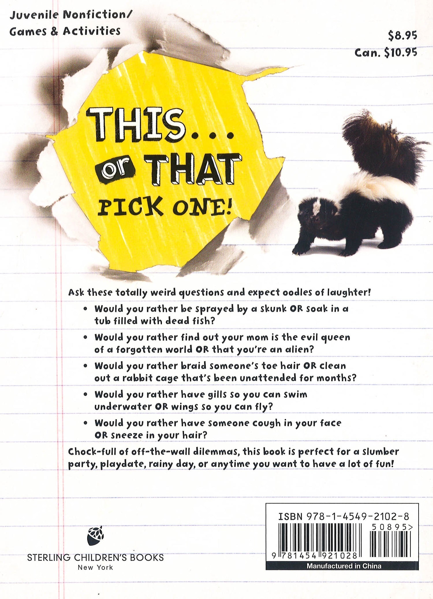 THIS . . . OR THAT? You’ve got to pick one! Based on the game "Would You Rather?" where you ask a friend to choose between two equally unappealing options, this book is chock-full of fun questions. It's sure to provoke hours of hilarity and silliness. Here’s your quandary: Would you rather be sprayed by a skunk OR soak in a tub filled with dead fish? It’s up to you and you MUST choose . . . even if you don’t like either one! Kids will love asking their friends these silly, entertaining questions. Try it in school, at a party, or even at the dinner table with family.